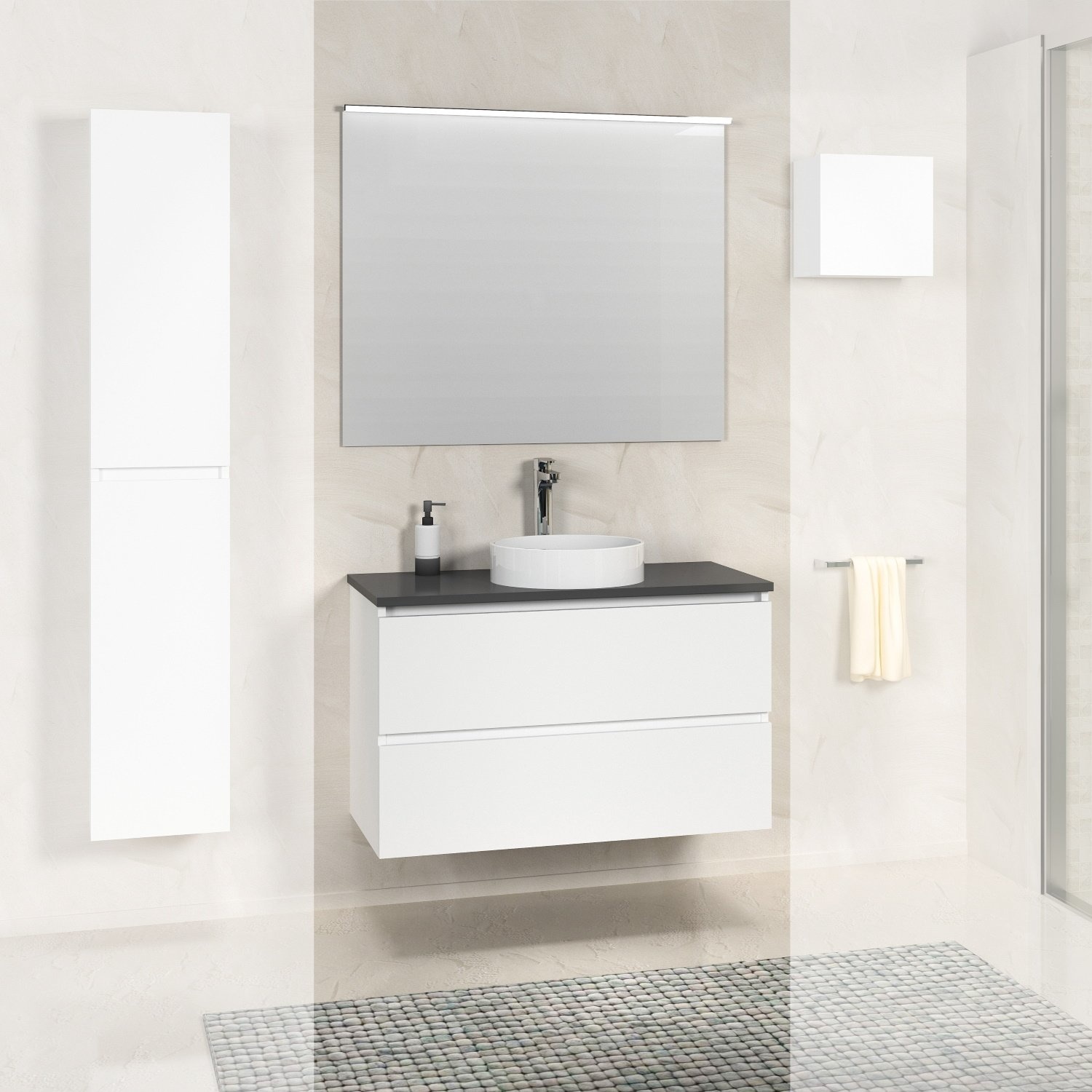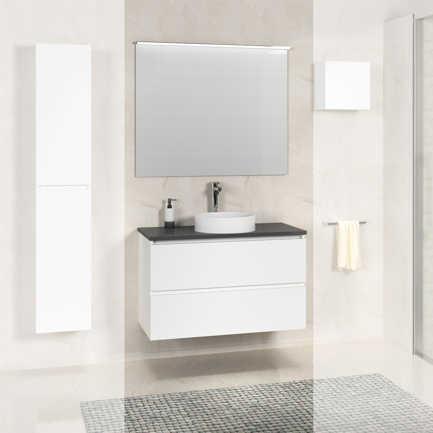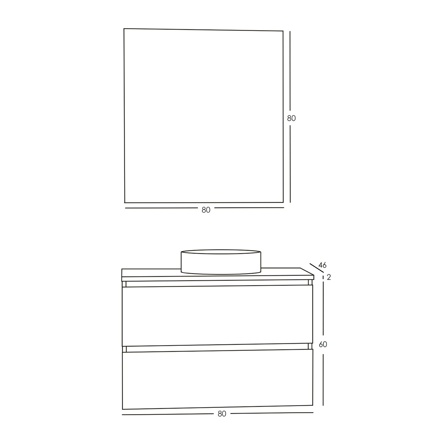 De onderkast is matglans gelakt en heeft een dikte van 16 mm. De onderkast is voorzien van soft-close geleiders voor de laden. De spiegel wordt ook meegeleverd en is voorzien van LED-verlichting (zonder schakelaar) in een kroonlijst.