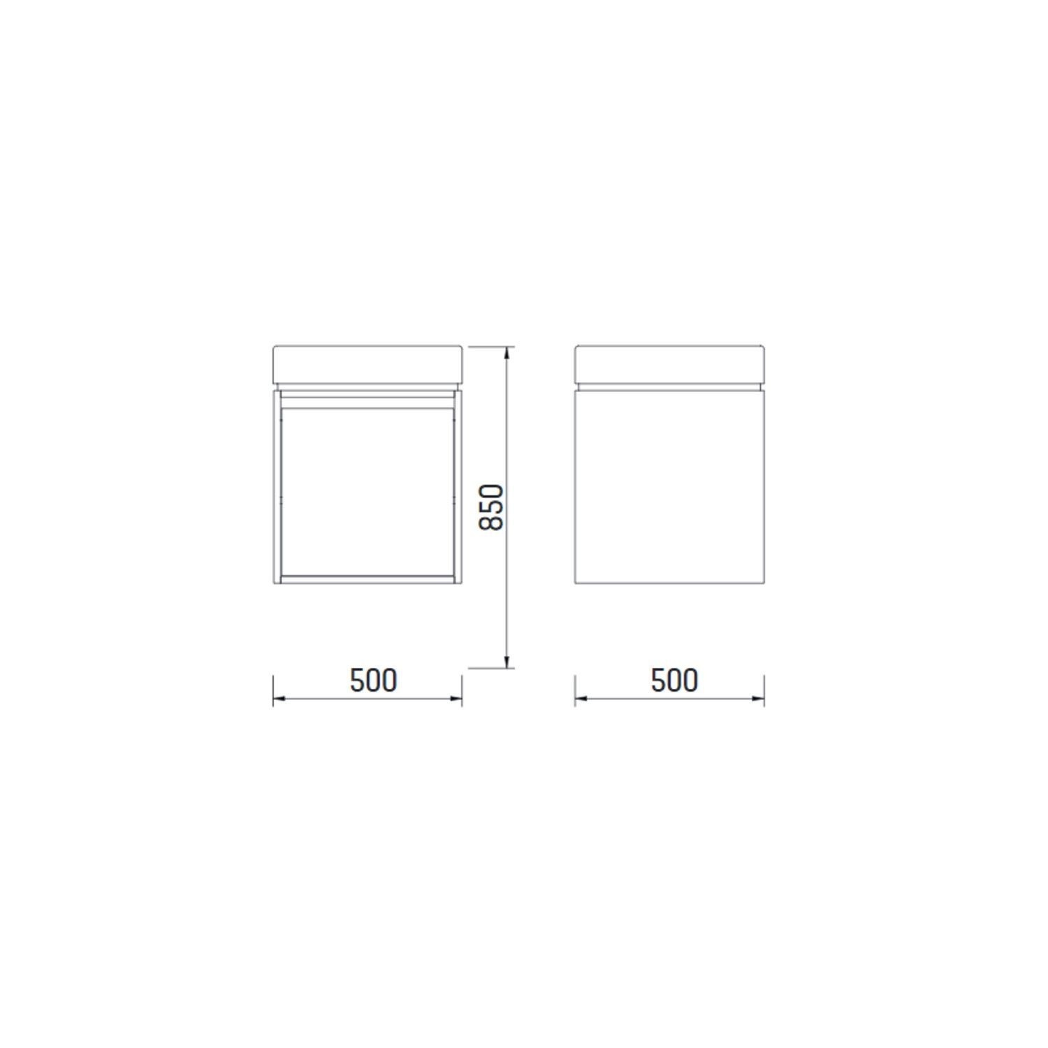 De kast heeft een breedte en diepte van 50 cm en is, wanneer de waskom is geïnstalleerd, 85 cm hoog. Zonder waskom bedraagt de hoogte 71 cm.