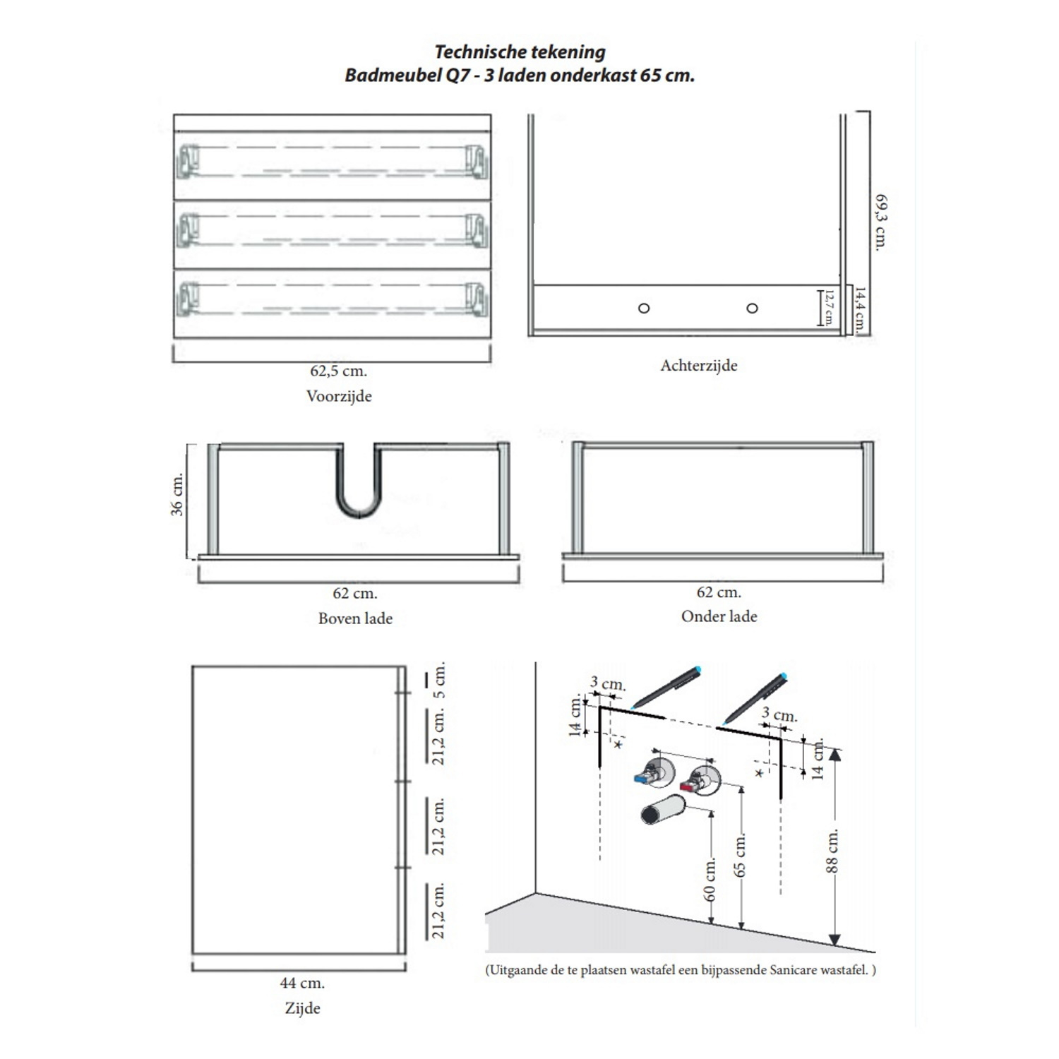 De onderbouwkast heeft een breedte van 65 cm, een hoogte van 71 cm en een diepte van 45 cm. Verder is de kast afgewerkt in de kleur Belluno-Eiken, wat een sfeervolle ambiance aan uw badkamer zal geven. De onderkast behoort tot de Q7-serie van het merk Sanicare en is perfect te combineren met andere producten uit deze serie.