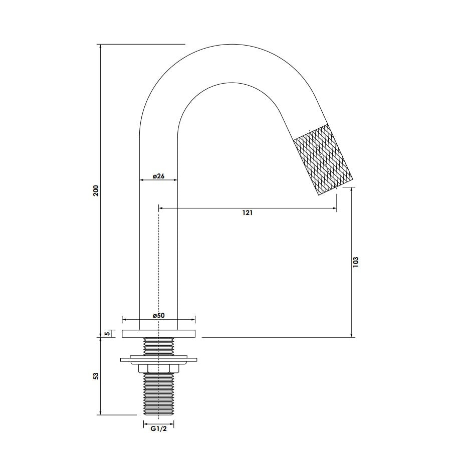 De fonteinkraan heeft een uitloop hoogte van 10,3 cm en een diameter van 2,6 cm. De aansluiting van de fonteinkraan is 1/2 inch en gemaakt van messing.