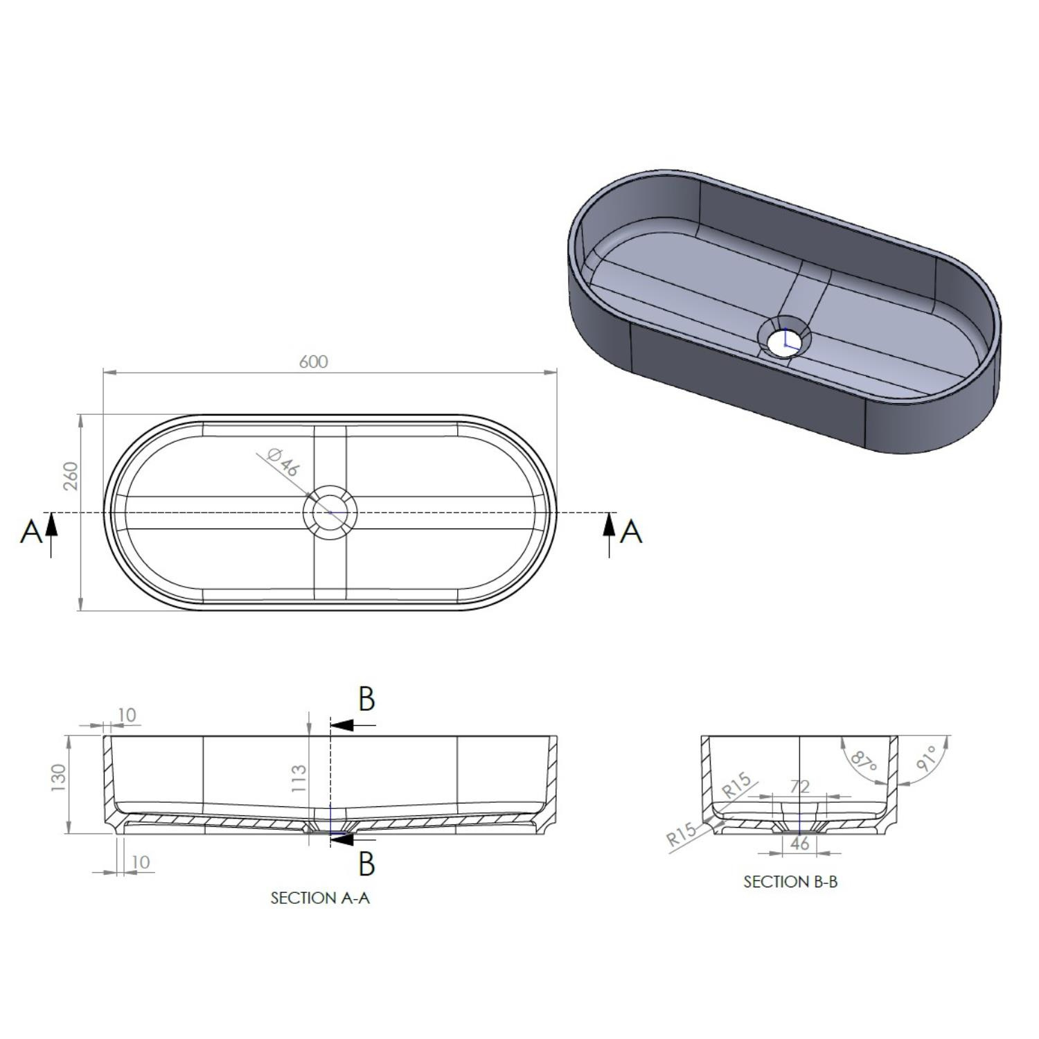Deze specificieke waskom is ovaal en heeft een breedte van 60 cm. De kom is 26 cm diep en 13 cm hoog. Deze kom is uitgevoerd in een glanzend witte kleur.