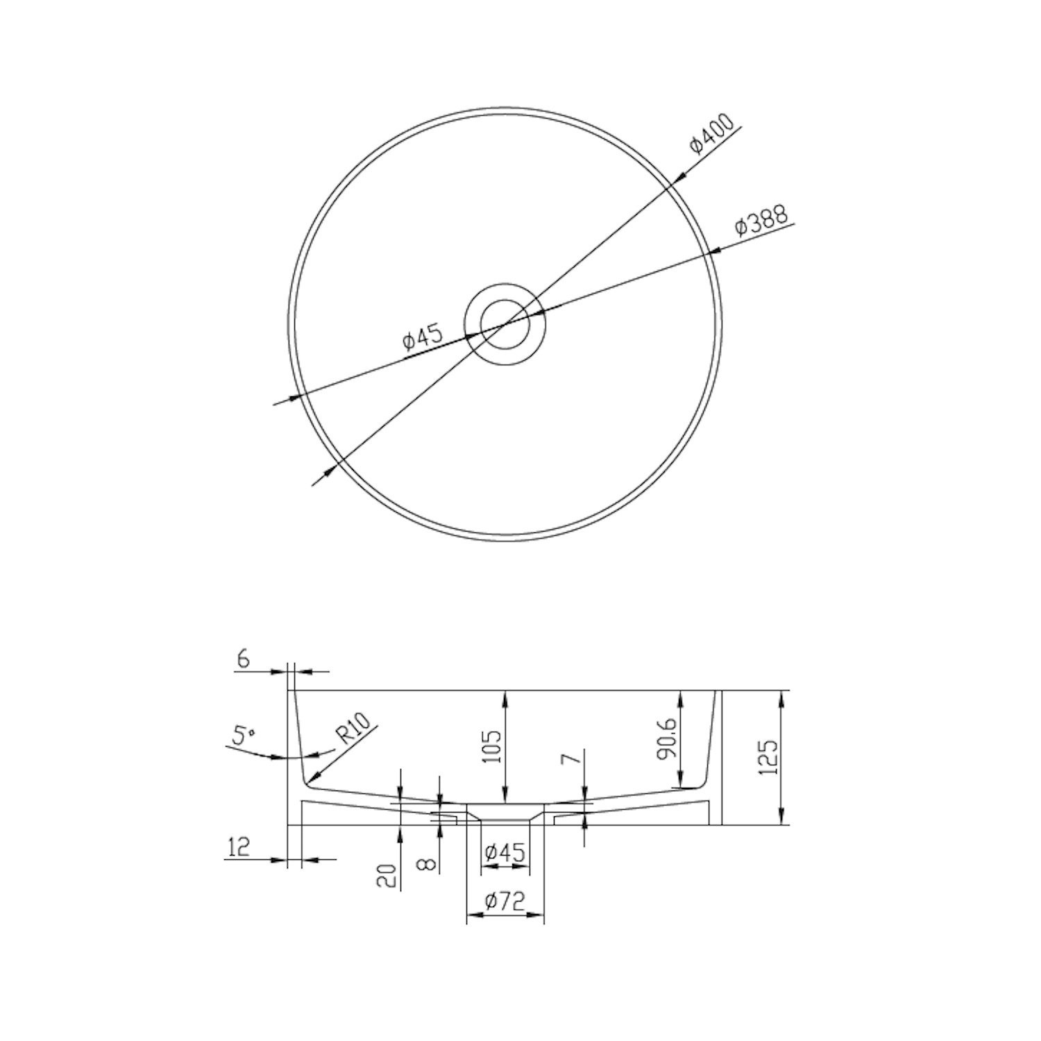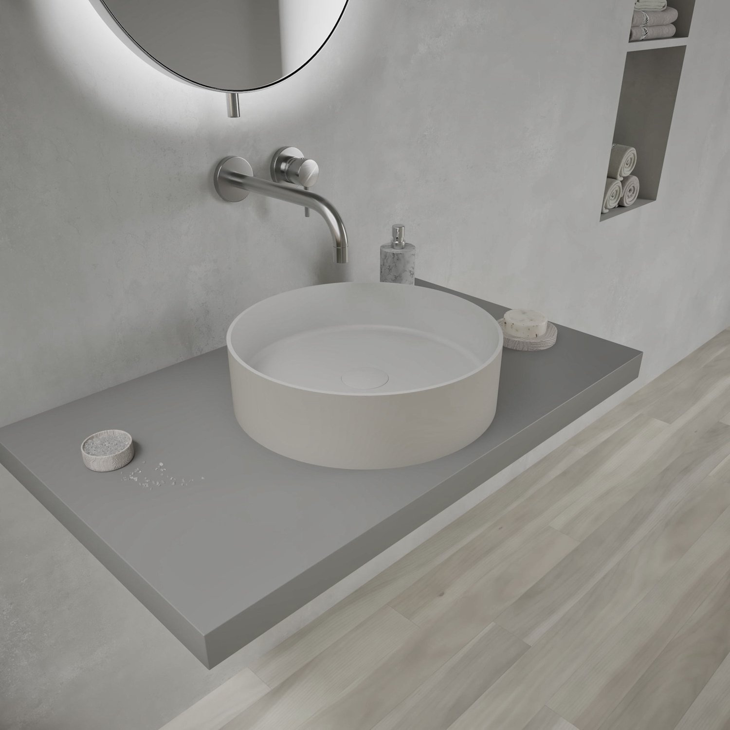 De vrijstaande wasbak met een dunne rand van 6 mm. Het matte, fluweelachtige oppervlak van de wasbak voelt prettig aan en is makkelijk schoon te maken en te onderhouden. De wasbak heeft de kleur mat grijs van buiten en mat wit van binnen.