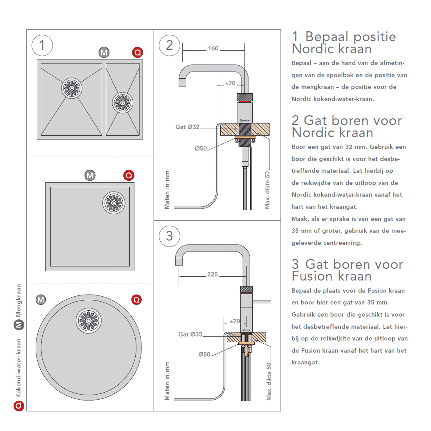De Nordic Square Twintaps is een set kranen bestaande uit een kokendwaterkraan en een mengkraan in hetzelfde design met een ronde uitloop. De kokendwaterkraan bevat een dubbelwandige uitloop, zodat deze niet te heet wordt om vast te pakken. U drukt de ring twee keer naar beneden met een kwartslag draai. U ziet de rode lichtring oplichten. Hieraan kunt u zien dat de kokendwater tap geactiveerd is.