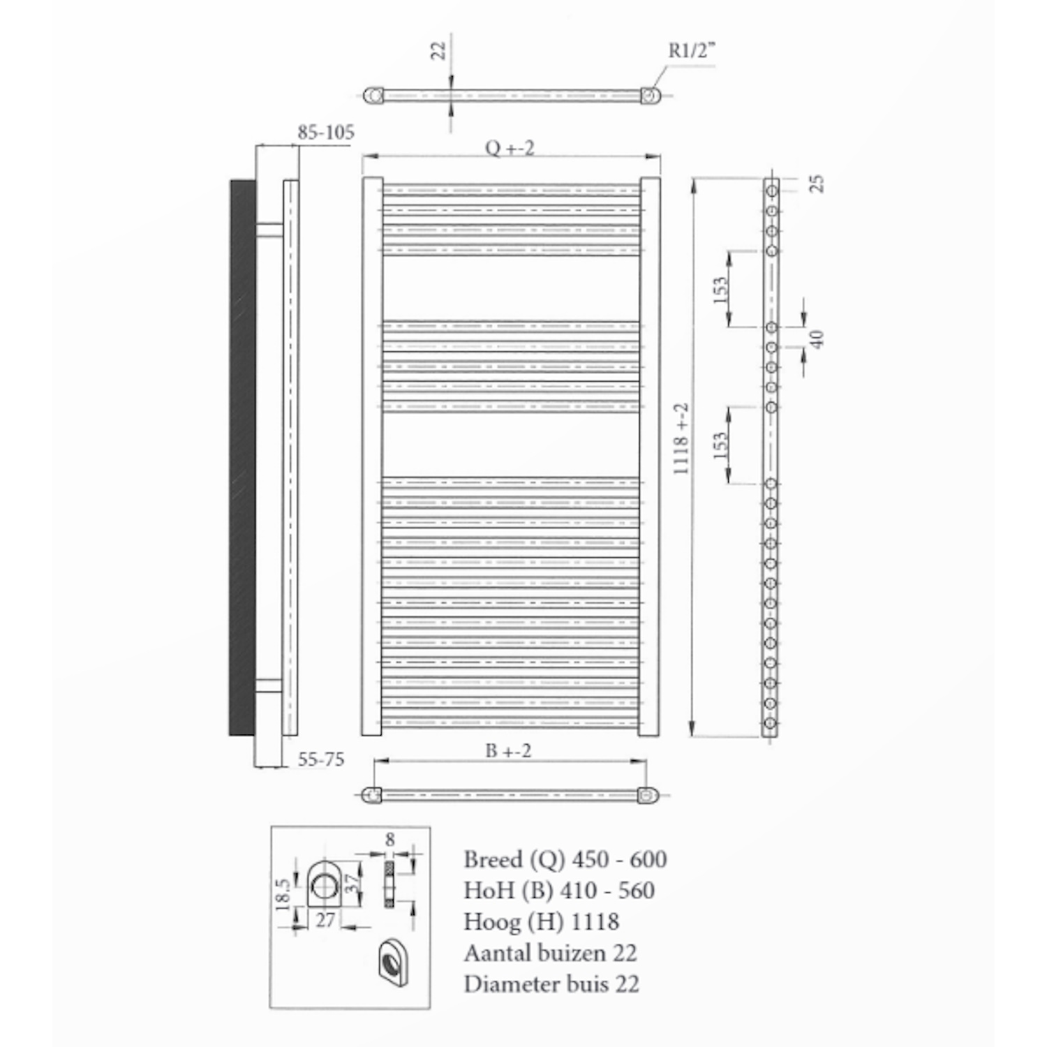 Voeg kwaliteit en stijl toe aan uw badkamer met deze Sanicare design radiator! De radiator is 111,8 cm hoog en 45 cm breed. Ook wel een buisradiator of handdoekradiator genoemd. Deze radiator bestaat uit buizen met ruime plaats om uw handdoeken op te hangen en ze te verwarmen. De radiator neemt niet veel ruimte in beslag en brengt een vleugje luxe naar uw badkamer. De radiator voorziet u van warme handdoeken in een mum van tijd. Sanicare handdoekradiatoren zijn vervaardigd van hoogwaardig staal voor langdurige kwaliteit en zijn leverbaar in diverse kleuren. Deze radiator is te verkrijgen in verschillende kleuren. De kleuren zijn: gunmetal, mat zwart, inox-look en chroom. Dit model radiator is er ook in 172 cm hoog en in een elektrische uitvoering.