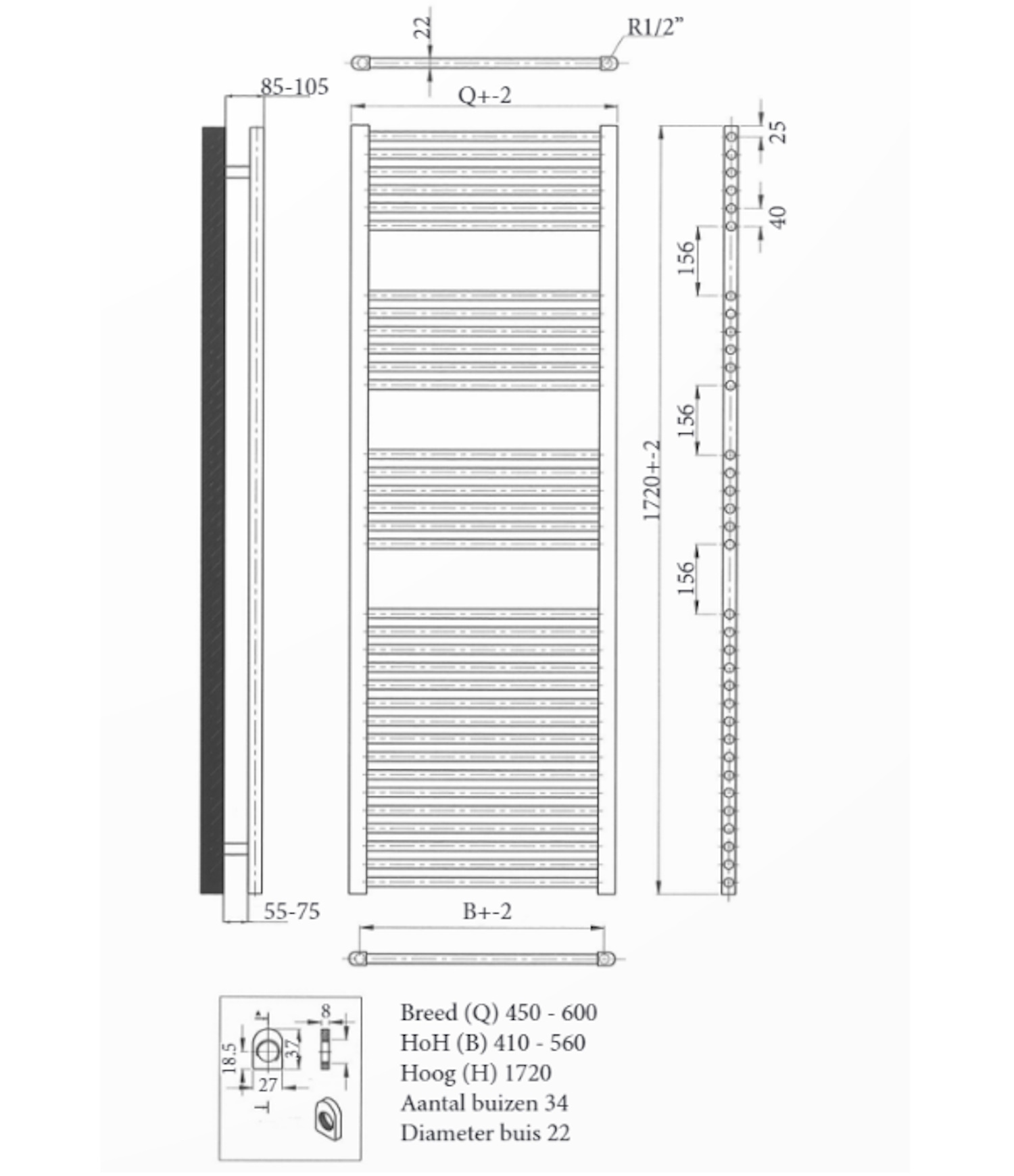 De radiator heeft een hoogte van 172 cm en een breedte van 45 cm. De radiator is te bestellen in de kleuren wit, gun metal, inox-look, zilver-grijs en zwart. De thermostaten zijn in de kleuren chroom, zwart en wit te verkrijgen.