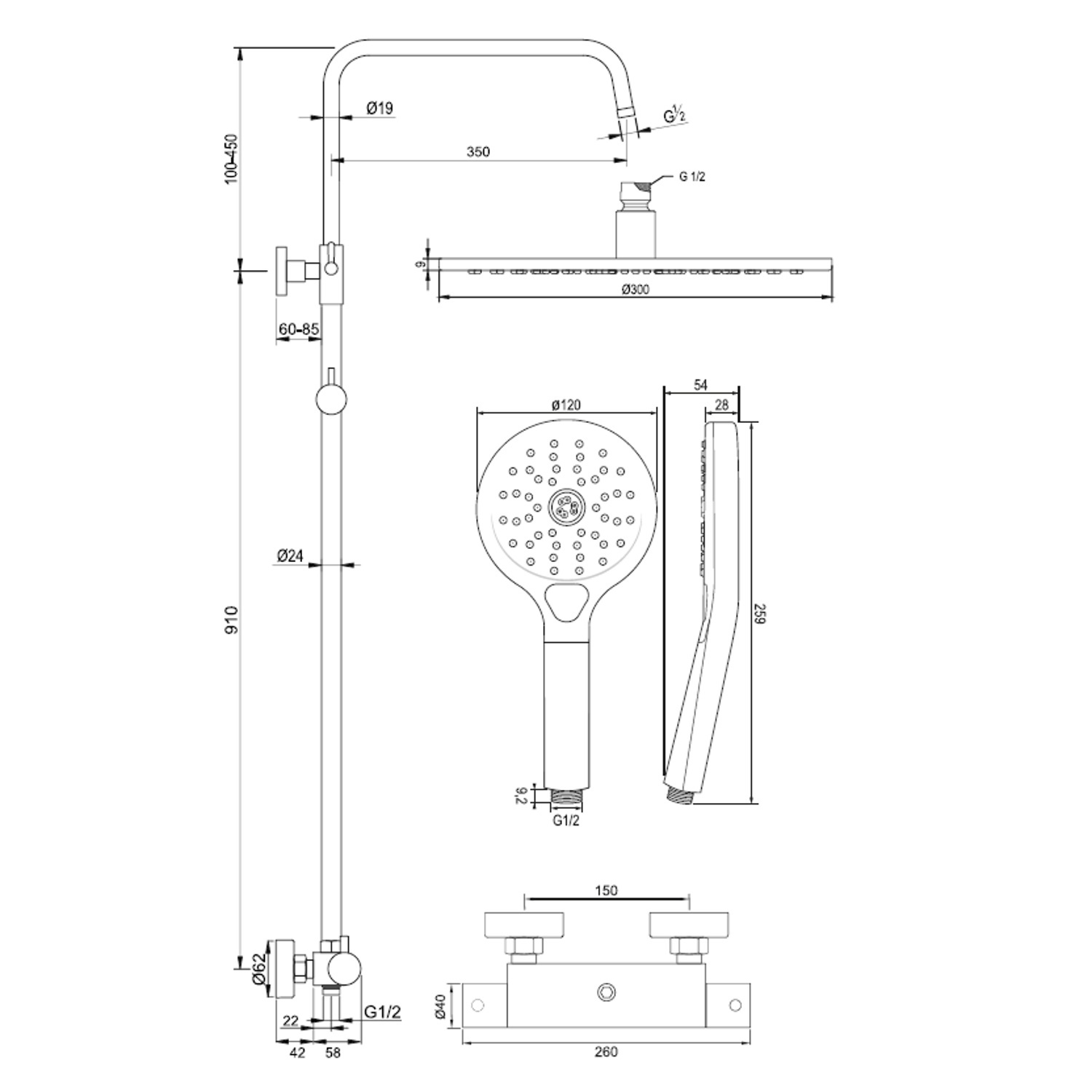 De complete regendouche set is voorzien van een thermostatische mengkraan, douchekop met een doorsnee van 30cm, verstelbare muurbuis, S-koppelingen en rozetten. De doucheset is gemaakt van messing en het is koper van kleur.