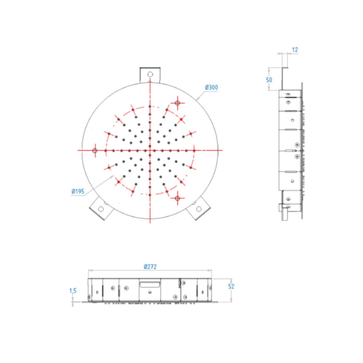 De douchekop heeft een diameter van 30 cm. De spuitgaten betrekken een oppervlakte van 19.5 cm in diameter. Het inbouwgat dient 27.2 cm te zijn en de inbouwdiepte van deze douchekop is 5.2 cm. Het gedeelte van douchekop dat daadwerkelijk zichtbaar is, is slechts 1.5 mm dik.
