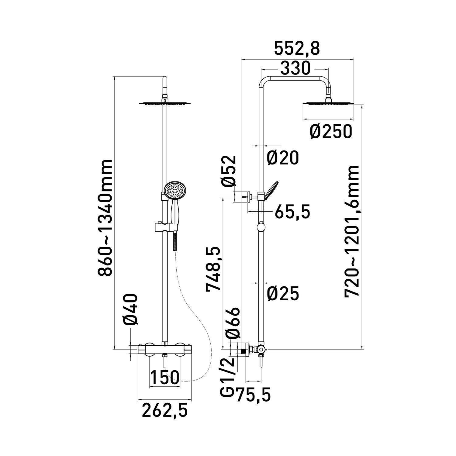 De glijstang is verstelbaar in hoogte van 86 cm tot 134 cm. De thermostaatkraan heeft een hart op hart maat van 15 cm. De set wordt inclusief montage materiaal geleverd.