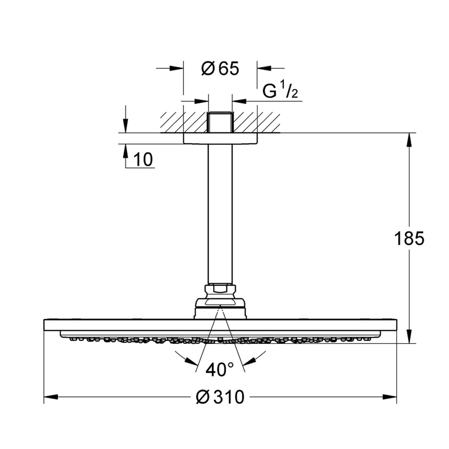 De hoofddouche heeft een diameter van 31 cm en de plafondarm is 18.5 cm lang. Maak uw badkamer compleet met andere producten van Grohe in de kleur Cool Sunrise.
