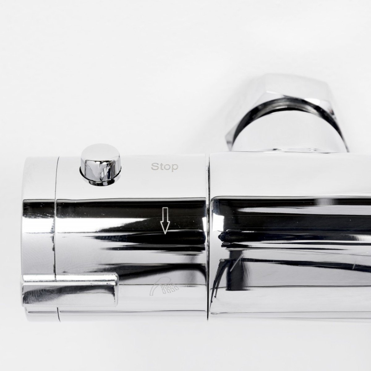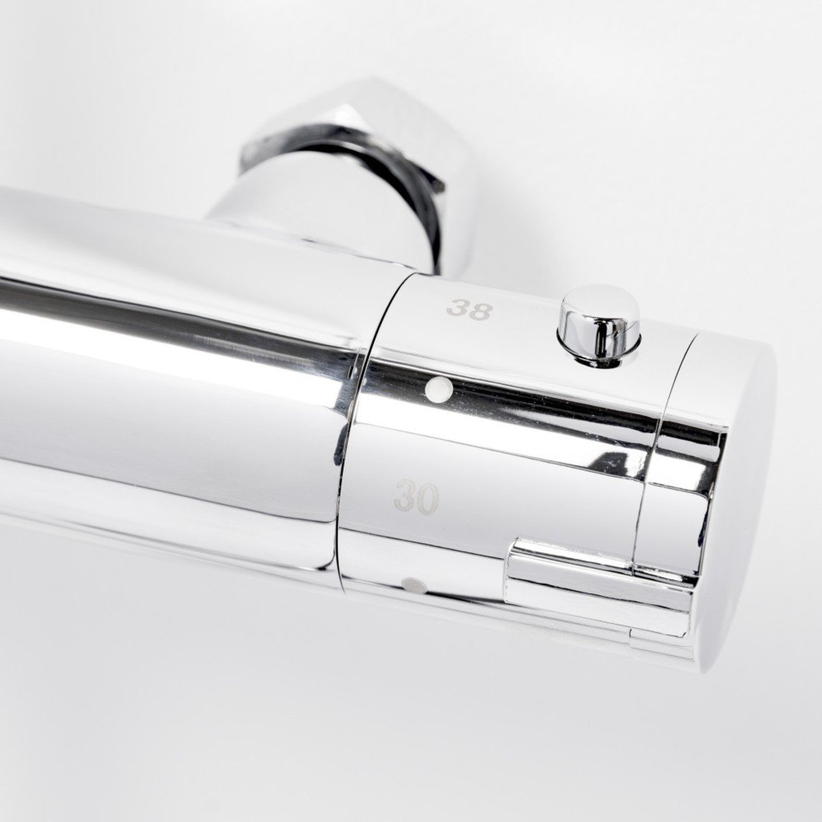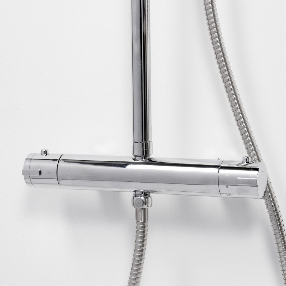 Het Mono douchesysteem van het merk Aqualux is een complete Opbouw regendoucheset bestaande uit een glijstangset, een thermostatische kraan, een hoofd- en handdouche en een doucheslang. De thermostatische kraan beschikt over twee knoppen waarmee u de douche aan- en uitschakelt. Bovendien dient de linkerknop als omstelknop waarmee u eenvoudig switcht tussen de hoofd- en handdouche. Met de rechterknop wordt de temperatuur bepaald.