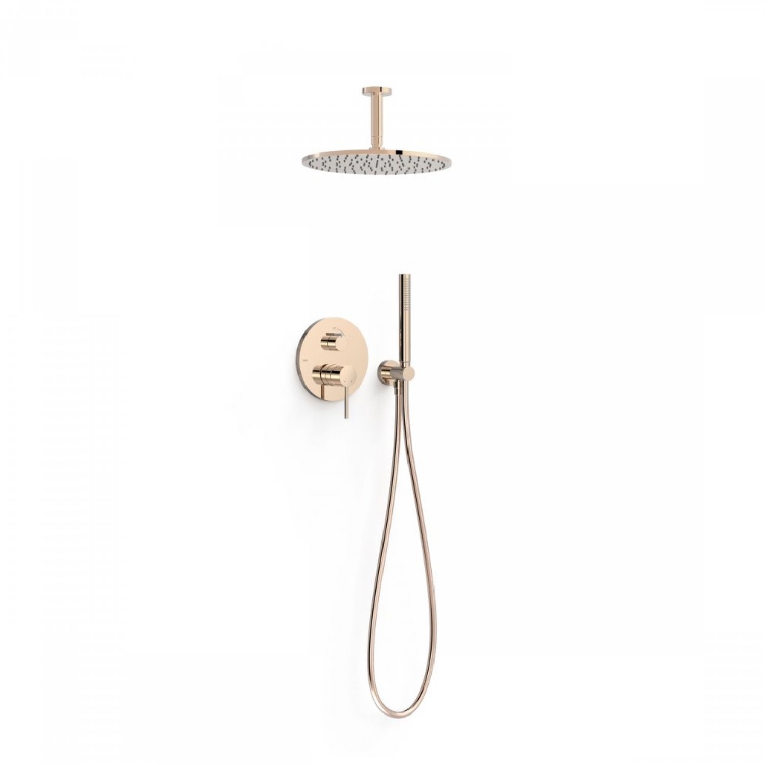 De hoofddouche heeft diameter van 30 cm. De plafondarm is 13,9 cm lang. De afdekplaat heeft een diameter van 17,8 cm. De sproeier is van roestvrijstaal en roest dus ook niet. De douchekoppen zijn gemakkelijk schoon te houden. U verwijdert de kalk simpelweg door met uw vinger over de nopjes heen te wrijven. Deze set heeft de kleur rosé goud. Deze set bevat een snelle en eenvoudige installatiebox.
