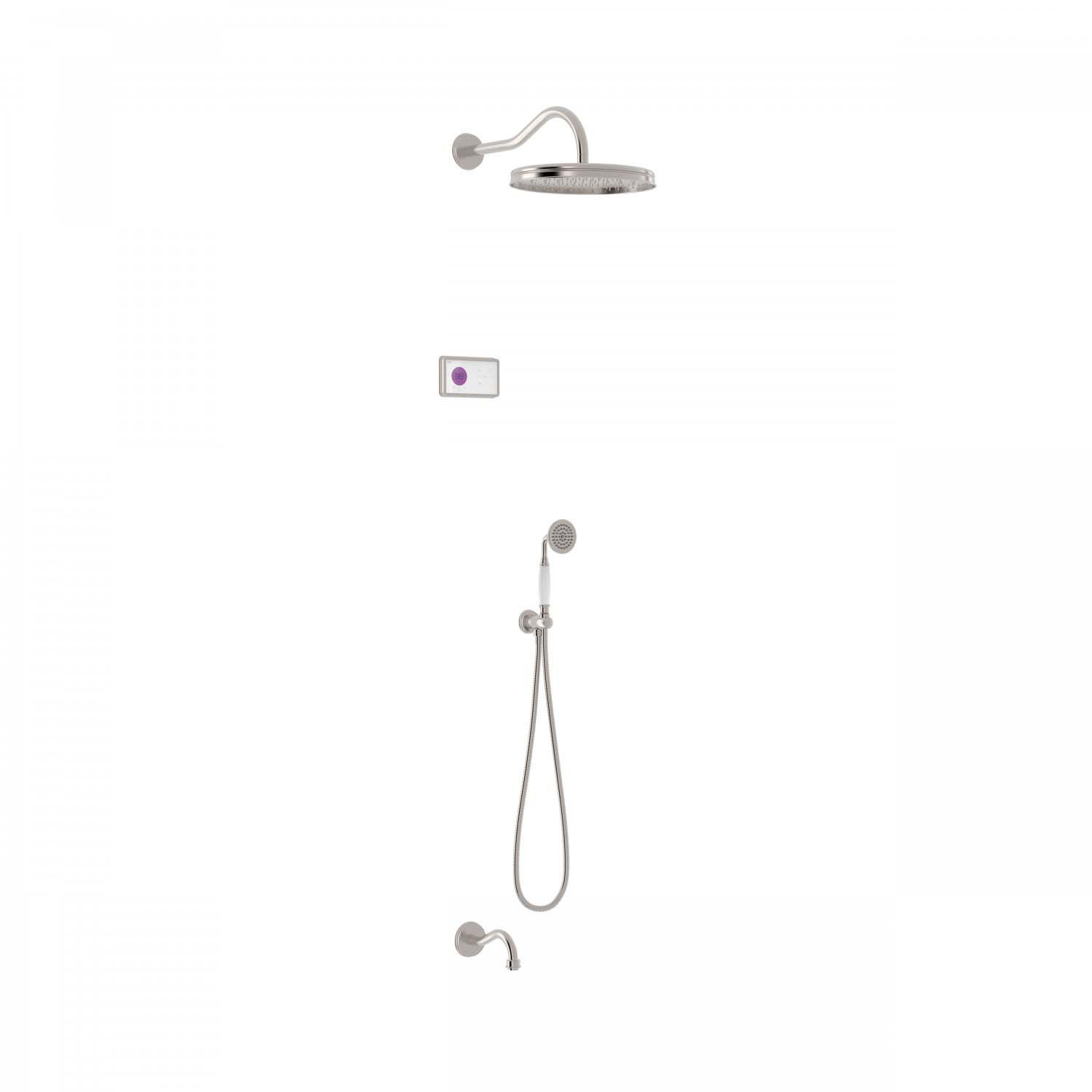 Deze regendoucheset van Tres komt uit de Clasic serie. Deze serie bestaat uit allemaal artikelen met een klassieke uitstraling. Dit is inbouwdouche is gemaakt van messing in een rvs kleur. De hoofddouche heeft een diameter 31 cm en de antikalk handdouche heeft een diameter van 7.8 cm. De inbouw thermostatische kraan is elektronisch en voorzien van vochtafdichtingen van Schlüter in een witte kleur. Door het keramische binnenwerk behoud deze kraan jarenlang zijn kwaliteit. De lengte van de geribbelde doucheslang is 170 cm. De hoofddouche heeft een uitloop uit de muur. Deze regendoucheset is inclusief baduitloop.
