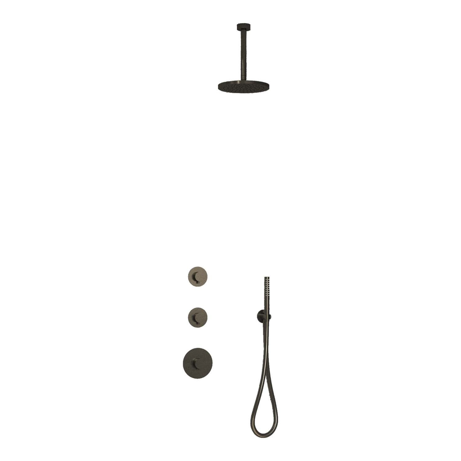 De set wordt geleverd met thermostatische douchekraan, 2 stopkranen, een regendouchekop met bijpassende plafonduitloop, muuruitlaat, doucheslang en handdouche. Daarnaast heeft u de optie een alternatieve douchekop, handdouche, plafonduitloop en wanuitlaat te kiezen, eventueel voor een meerprijs.