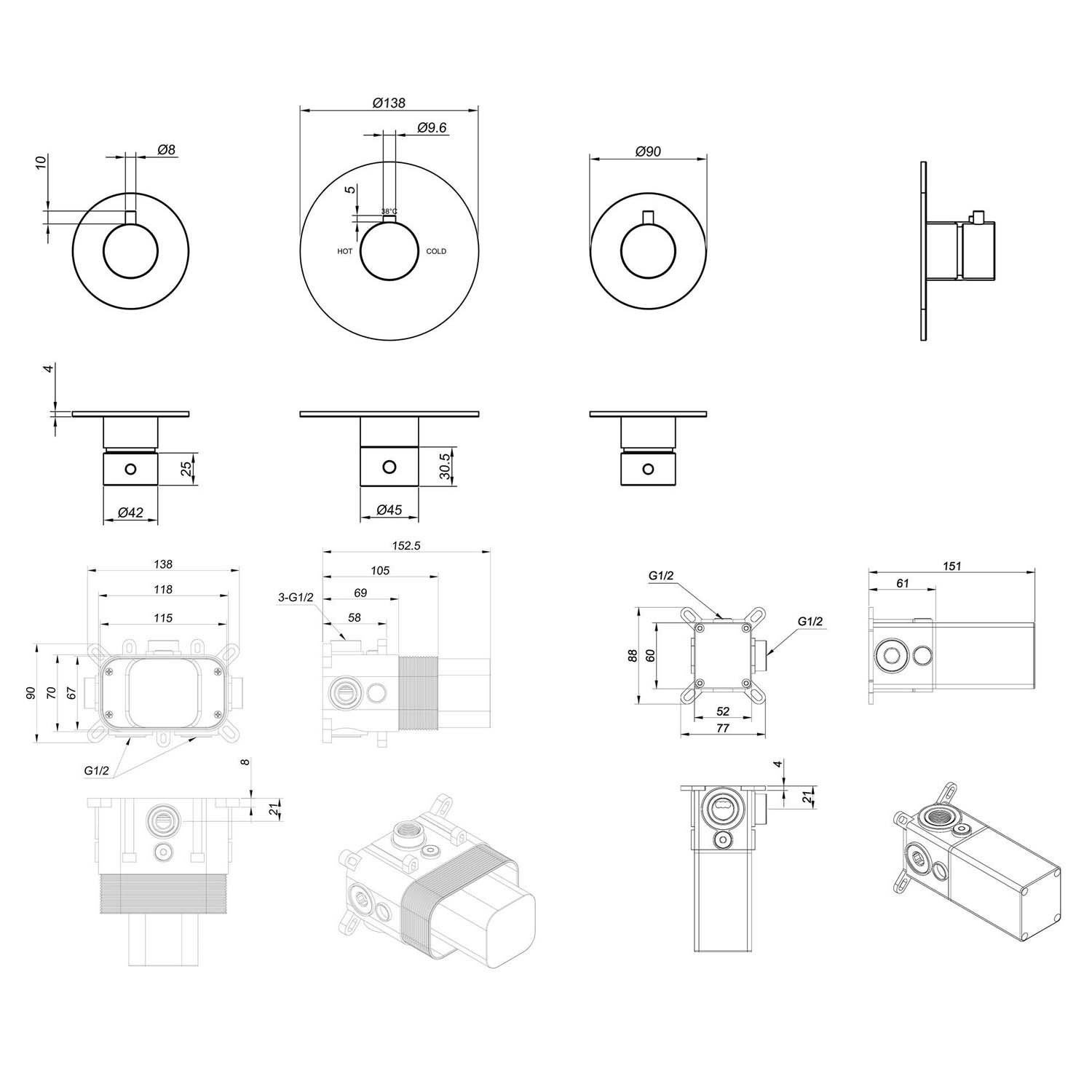 De douchekop heeft een diameter van 20 cm. De plafonduitloop is 15 cm lang. De handdouche heeft één stand en heeft een lengte van 21 cm. De doucheslang heeft een lengte van 150 cm en heeft een glad oppervlak. Daarnaast heeft de thermostatische douchekraan een diamter van 13.8 cm en zijn de stopkranen 9 cm in diameter. Alle drie de kranen zijn voorzien van een ronde knop. De inbouwbox van de douchekraan is 15.25 cm diep en de inbouwbox van de stopkranen is 15.1 cm diep.