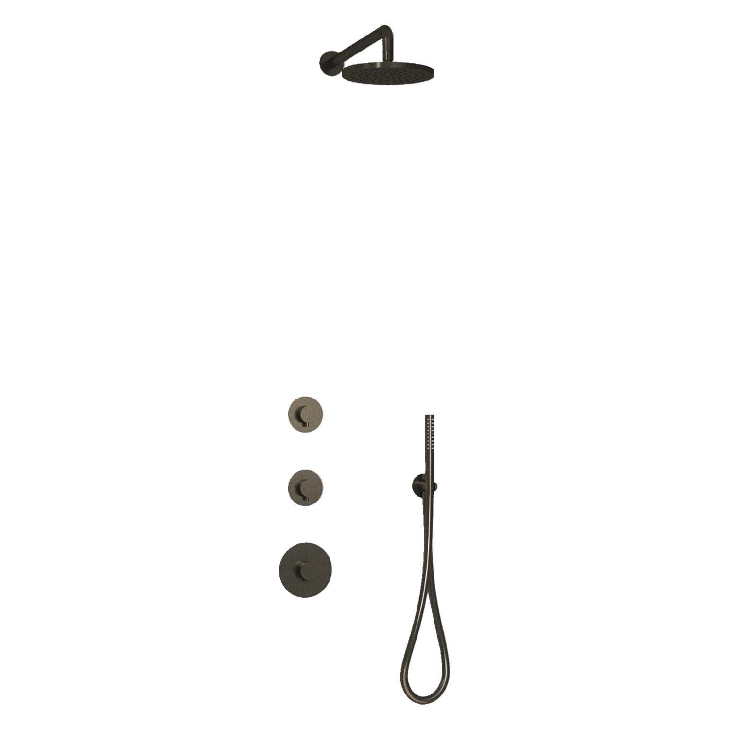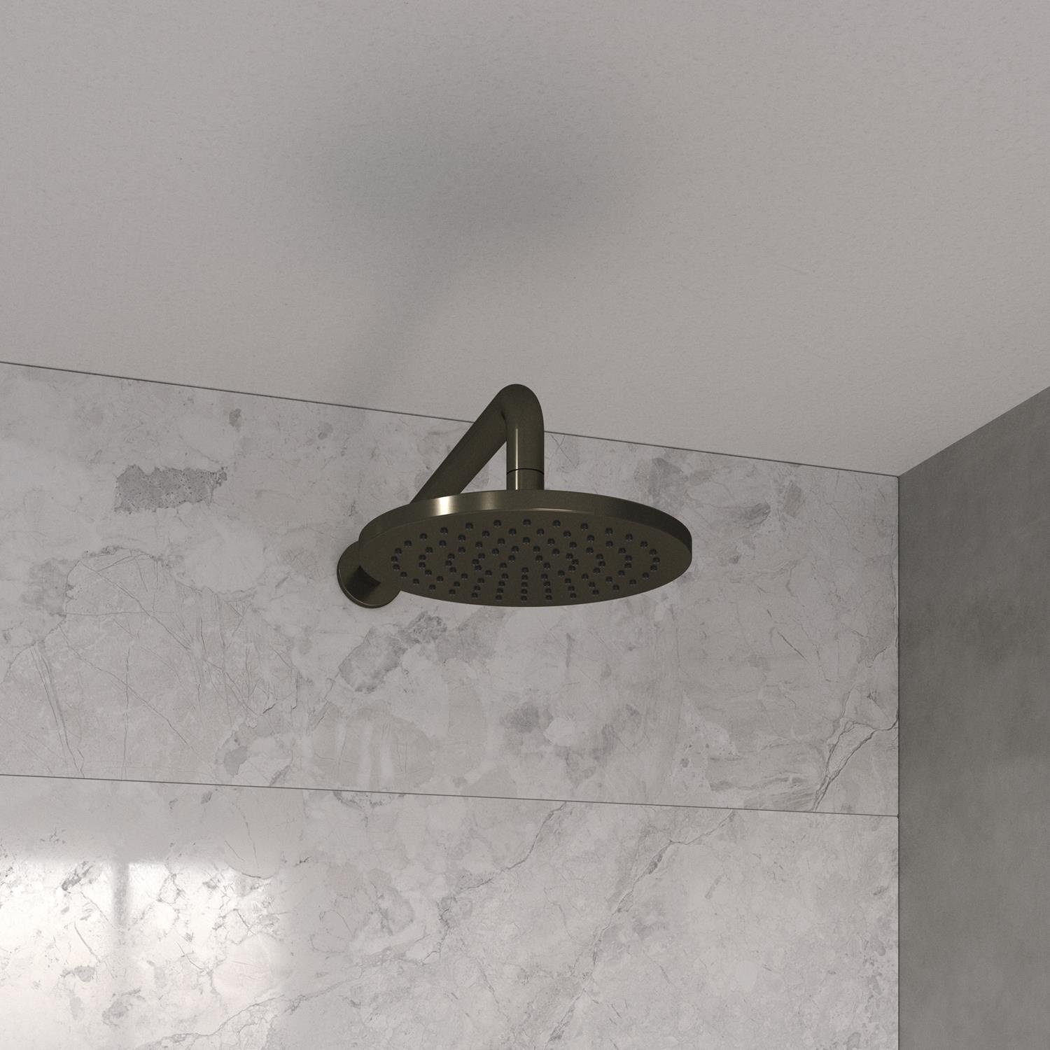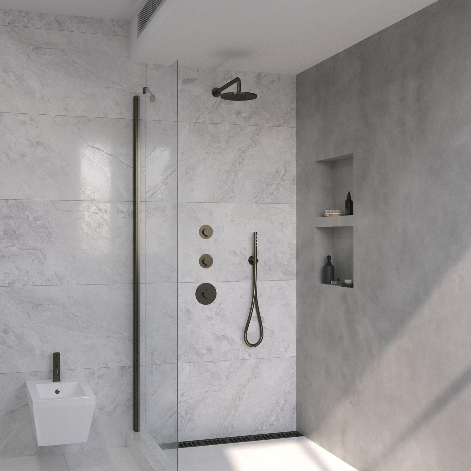 Naast het stoere Gunmetal, wordt deze set ook uitgevoerd in Chroom en Mat Zwart. Daarnaast is de set ook verkrijgbaar met plafonduitloop.