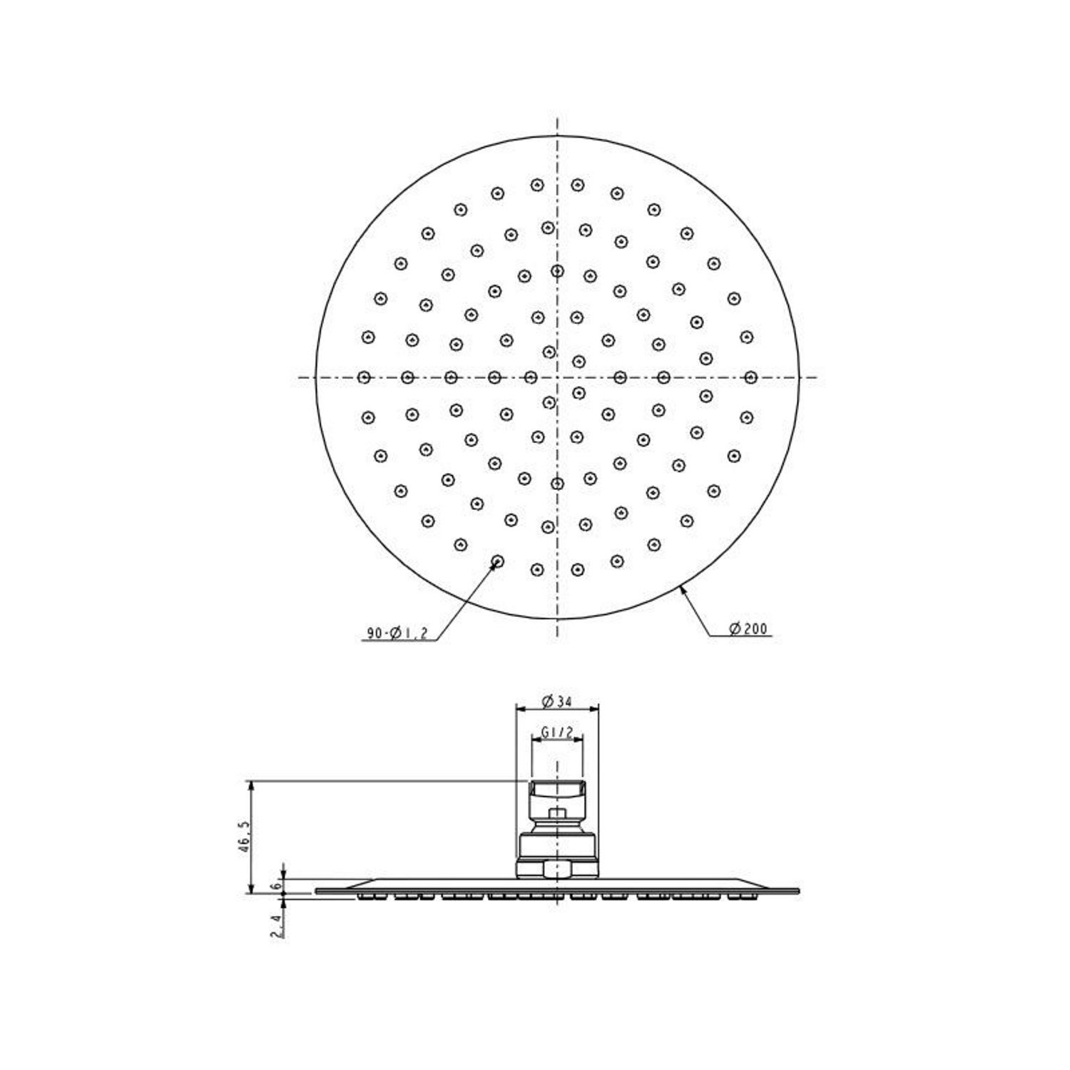De douchekop heeft een diameter van 20 cm. De wanduitloop is 35 cm lang. De handdouche heeft één stand en heeft een lengte van 21 cm. De doucheslang heeft een lengte van 150 cm en heeft een glad oppervlak. Daarnaast heeft de thermostatische douchekraan een diamter van 13.8 cm en zijn de stopkranen 9 cm in diameter. Alle drie de kranen zijn voorzien van een ronde knop. De inbouwbox van de douchekraan is 15.25 cm diep en de inbouwbox van de stopkranen is 15.1 cm diep.