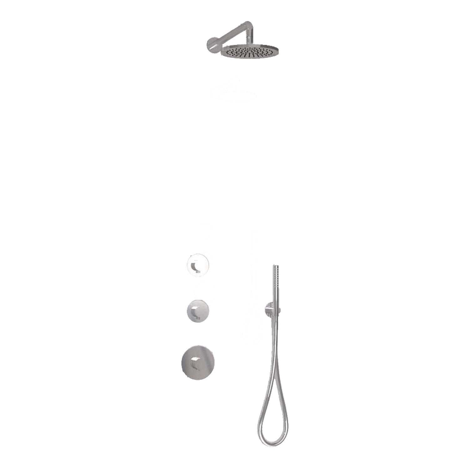 De set wordt geleverd met thermostatische douchekraan, 2 stopkranen, een regendouchekop met bijpassende wanduitloop, muuruitlaat, doucheslang en handdouche. Daarnaast heeft u de optie een alternatieve douchekop, handdouche, wanduitloop en wanduitlaat te kiezen, eventueel voor een meerprijs.