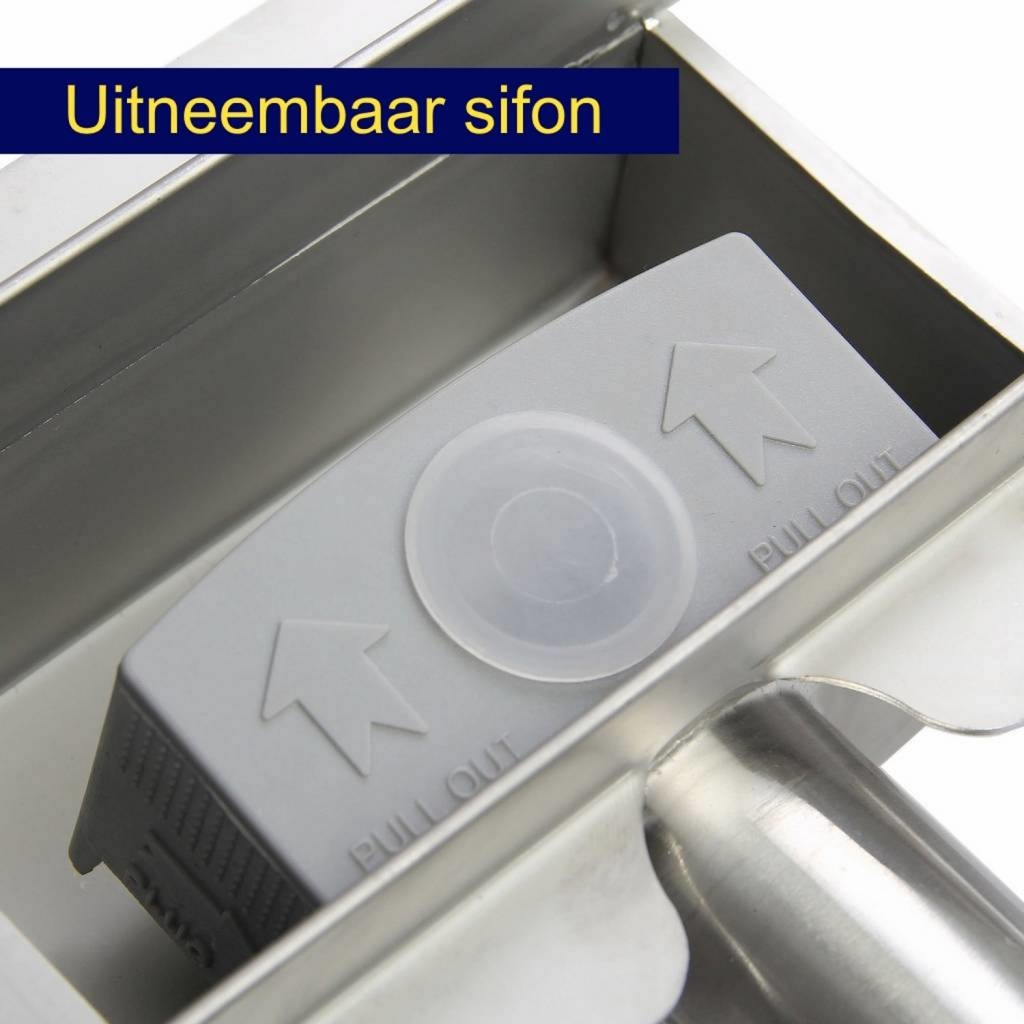 De sifon is uitneembaar waardoor u de goot goed schoon kunt houden. De sifon is slechts 6.7cm diep geïntegreerd. Als u er nog een haarfilter bij doet, hoeft u helemaal niet meer bang te zijn voor verstopping!