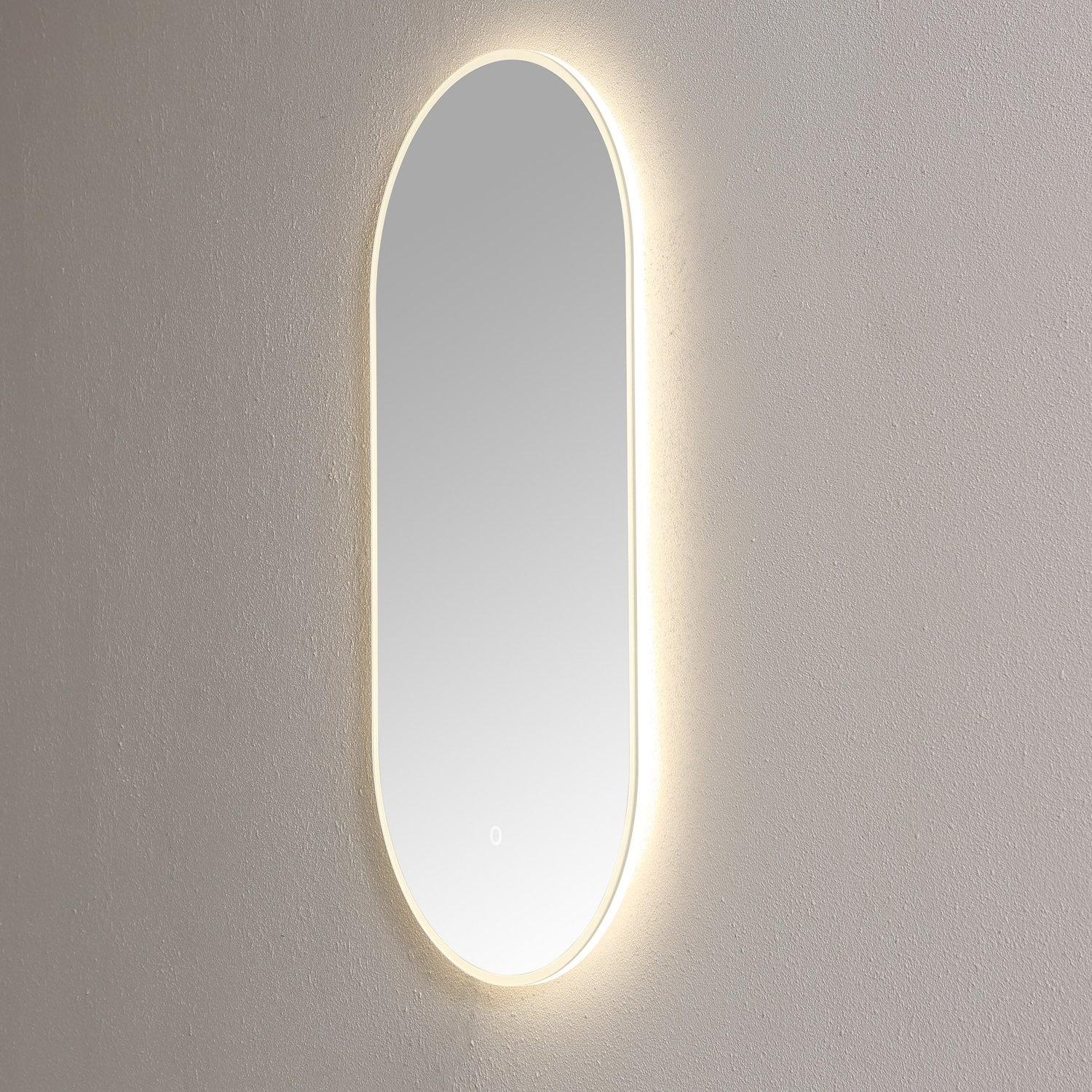 Deze spiegel van Sanilux heeft een ovale vorm met een omranding. De spiegel heeft een afmeting van 90cm hoog en 45 cm breed. De omranding is 3 cm breed en is gemaakt van aluminium. De spiegel is niet voorzien van een schakelaar, radio of bluetooth. Maar dit zijn gelukkig niet de belangrijkste punten. Hij is namelijk wel voorzien van een touch sensor, de kleuren zijn instelbaar, hij is dimbaar en natuurlijk voorzien van spiegelverwarming. Wat wilt u nog meer?!