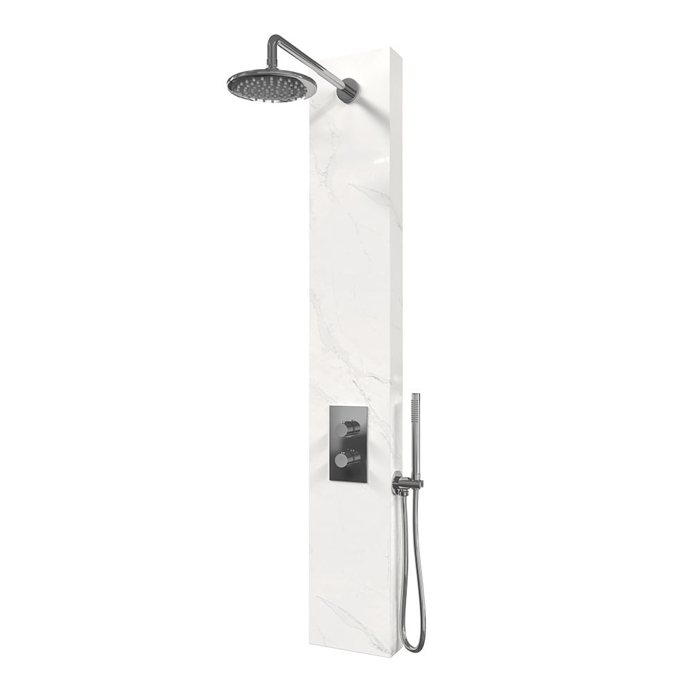 Het paneel beschikt over een thermostatische kraan. Bovenin bevindt zich de ronde stortdouche met een diameter van 20 cm. De uitloop waar de douchekop aan vast zit is maar liefst 40 cm lang.