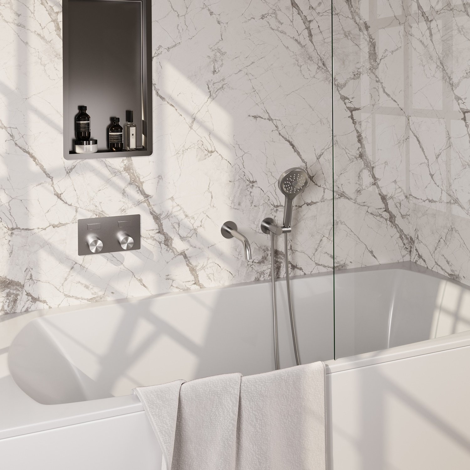 Deze thermostatische inbouw badkraan van het merk BRAUER behoort tot de Carving Edition serie. De badkraan is gemaakt van messing staal en komt dus uitstekend tot zijn recht in vochtige ruimtes. Met de inbouwthermostaat bepaalt u hoe warm u uw bad wilt. De badkraan is in de kleur RVS en is in nog 5 andere kleuren te verkrijgen: Koper geborsteld, chroom, gunmetal geborsteld, Goud geborsteld en mat zwart.