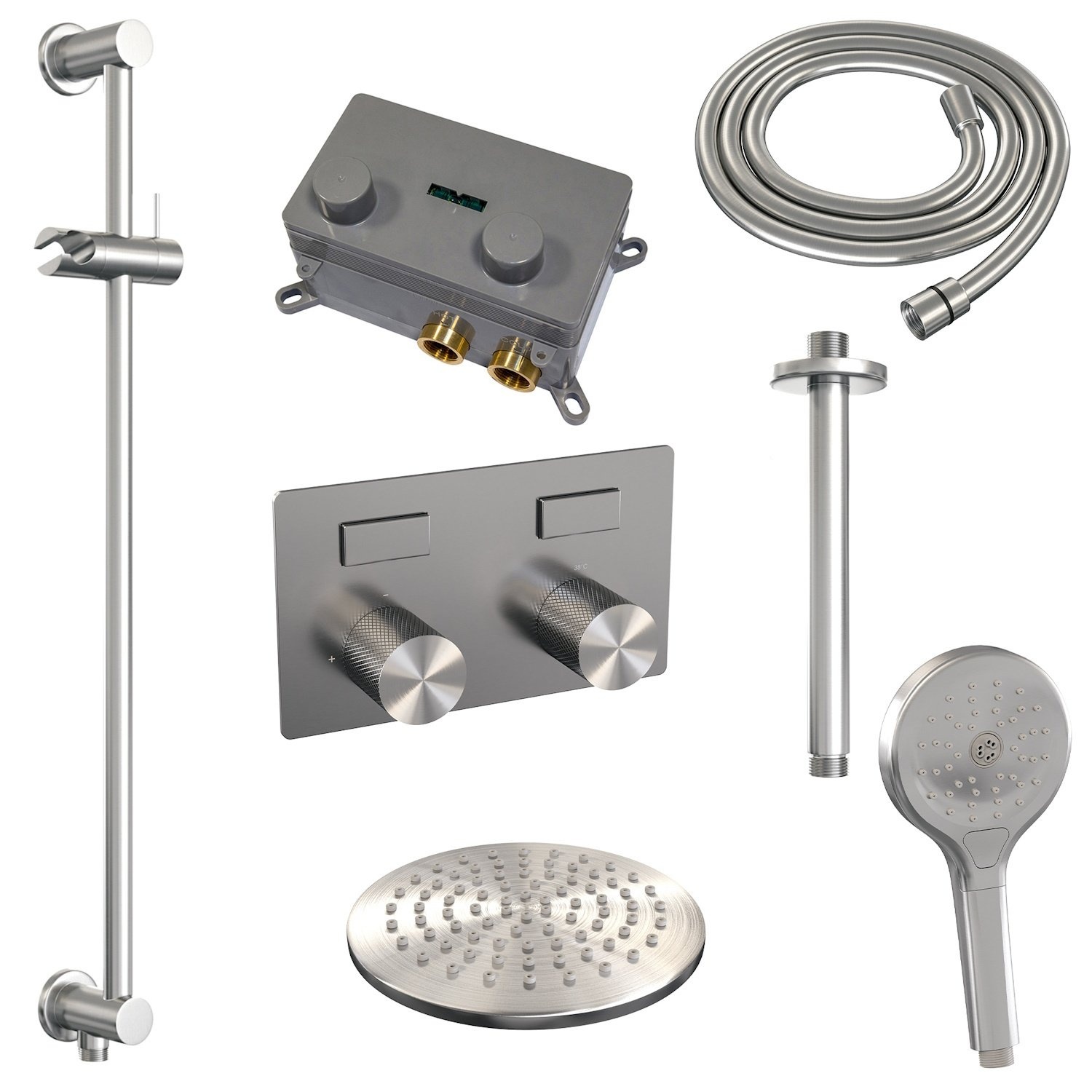 Dit artikel bestaat uit een thermostatische inbouw regendouche met drukknoppen, douchekop met een diameter van 20cm, een Plafondarm en 3-standen handdouche en doucheslang en geintegreerde glijstang.