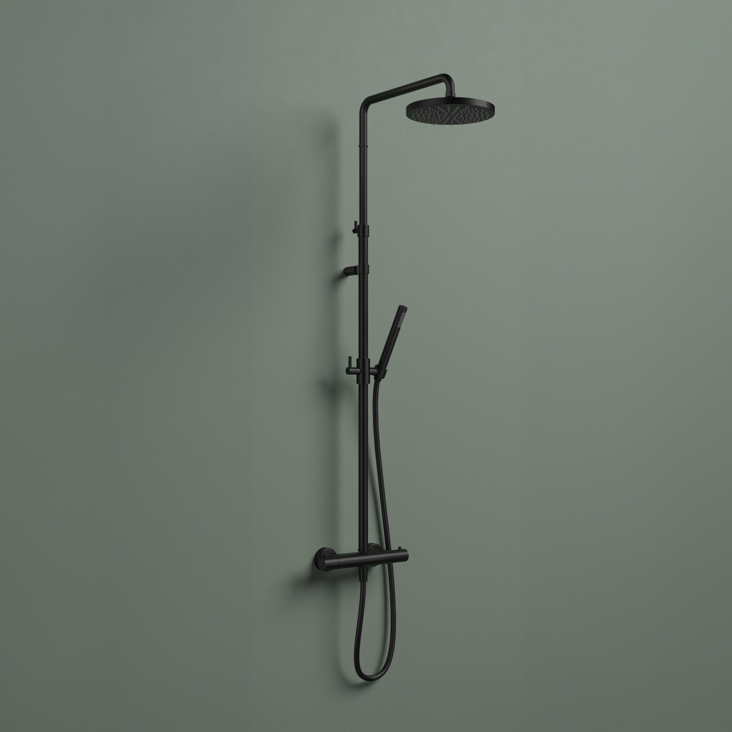 De set bestaat uit een thermostaatkraan, een staafhanddouche met doucheslang, een ronde hoofddouche met een diameter van 20 cm en een glijstang. Een complete regendouche in één dus!