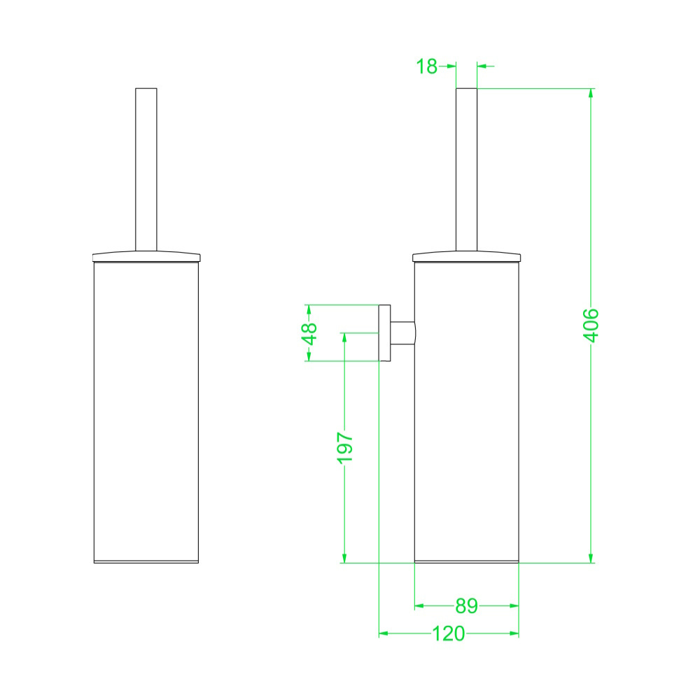 De toiletborstel heeft een hoogte van 40,6 cm en een breedte van 8,9 cm. de diepte is 12 cm.
