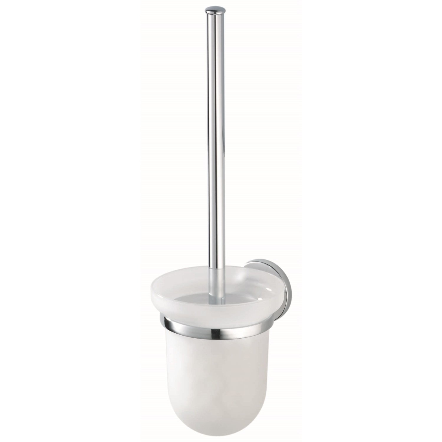 Toiletborstelset met een witte borstel en een glazen pot van mat glas. Het glas is zeer goed bestand tegen zuren en agressieve schoonmaakmiddelen, dus het blijft extra lang mooi. Opvallend is bovendien de sierlijke opstaande rand: een fraai detail.