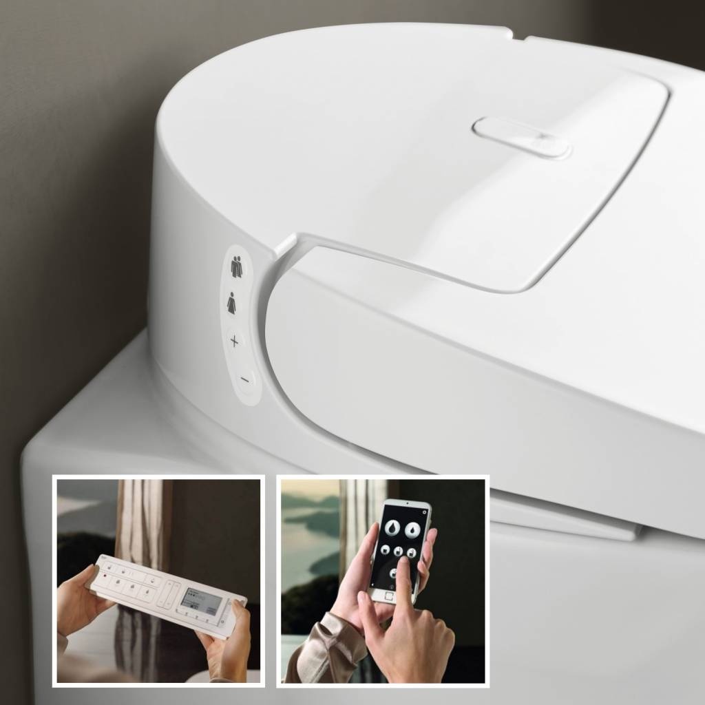 De douche-wc gebruikt geurafzuiging om de lucht te reinigen terwijl de combinatie van de toonaangevende Aquaceramics laag en het Hyperclean glazuur bacteriën en kalkaanslag tegenhouden. Gebruik het bedieningspaneel aan de zijkant van de zitting, de afstandsbediening of de smartphone app om het toilet te bedienen en in te stellen.