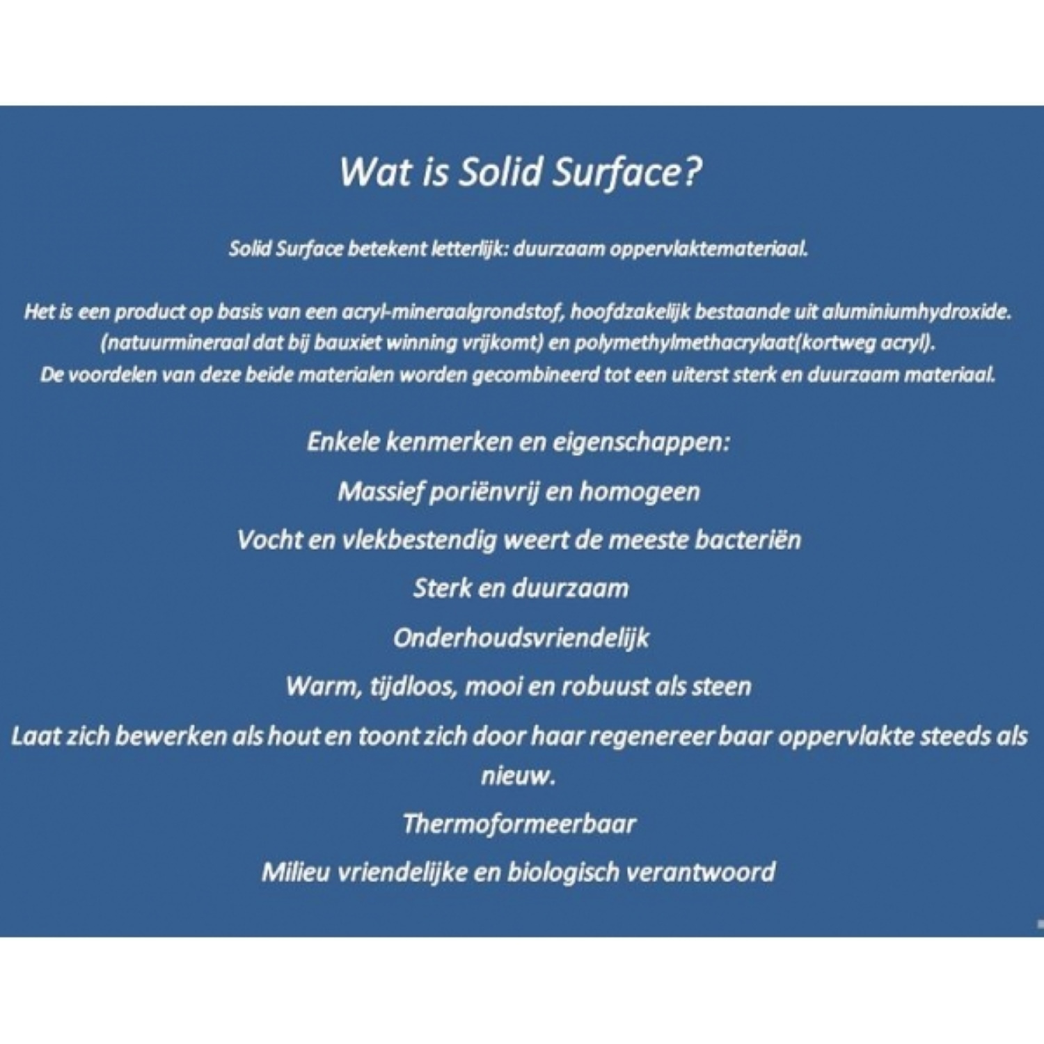 Solid surface heeft als grote voordelen dat het bad vocht- en vlekbestendig is, bacteriën geweerd worden en dat het oppervlak er altijd als nieuw uitziet. Bovendien is solid surface een milieuvriendelijk materiaal. Het ligbad heeft een lengte van 180 cm, een breedte van 84 cm en een hoogte van 56 cm, waardoor het bad zeer ruim is opgezet. Daarnaast beschikt het ligbad over een geïntegreerde overloop combinatie met een al gemonteerde afvoerplug. Ook wordt er een sifon bij dit bad meegeleverd.