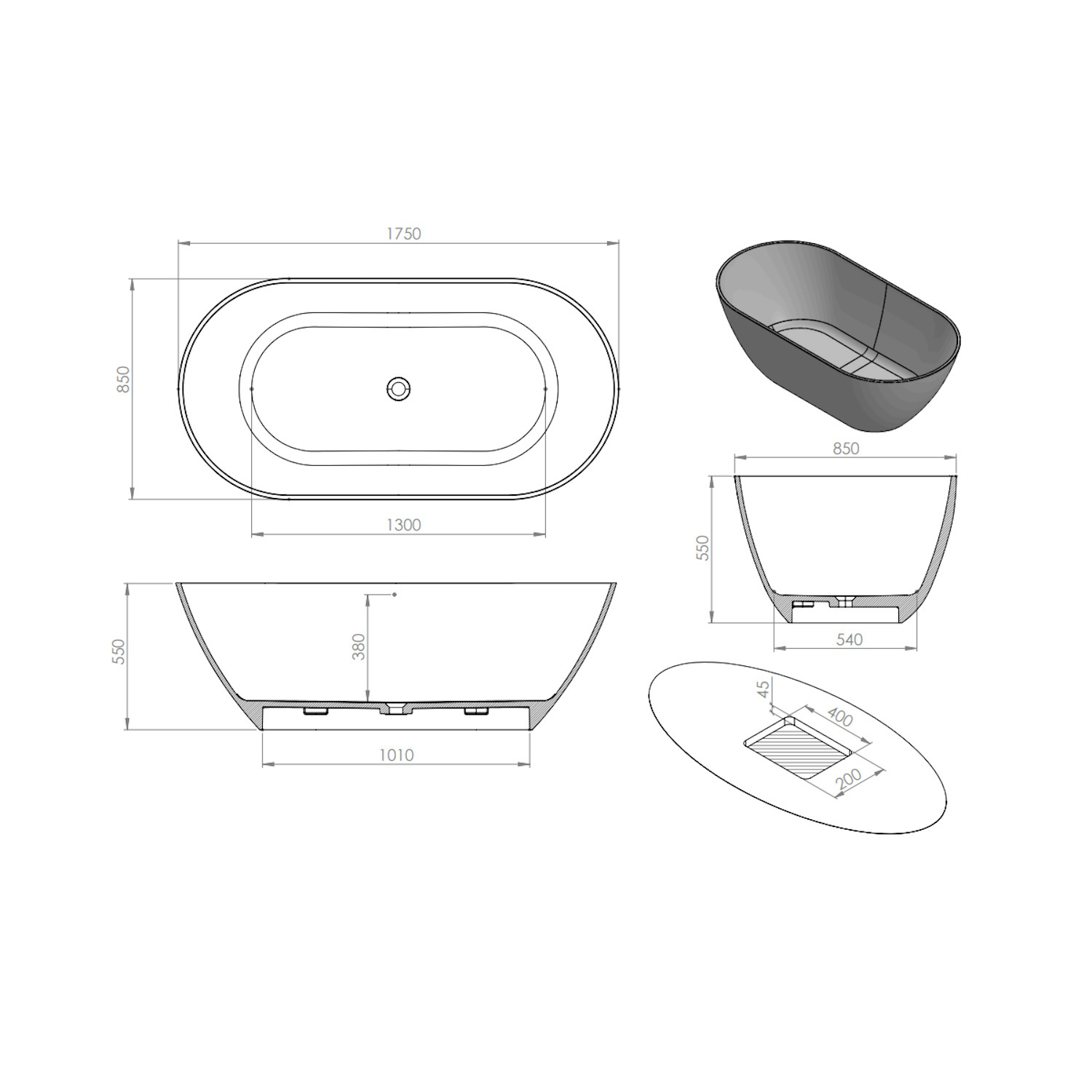 Het ligbad heeft een lengte van 175 cm, een breedte van 85 cm en een hoogte van 55 cm.