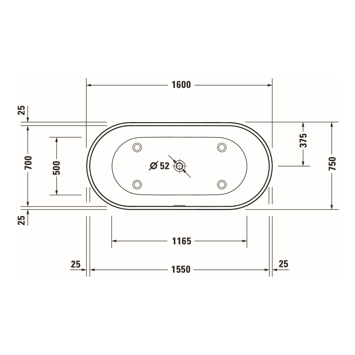 Het bad is voorzien van een overloop en een afvoergat in het midden van het bad. Het afvoergat heeft een diameter van 52 mm.