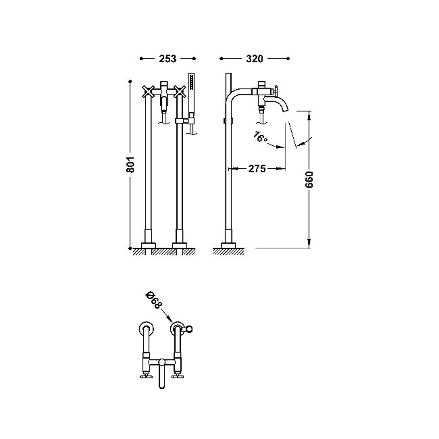De diepte van de kraan is 32 cm en de breedte is 25.3 cm. De vrijstaande kraan komt inclusief rozet. Die rozet heeft een afmeting van 6.8 doorsnede om het kraangat in de vloer weg te werken.