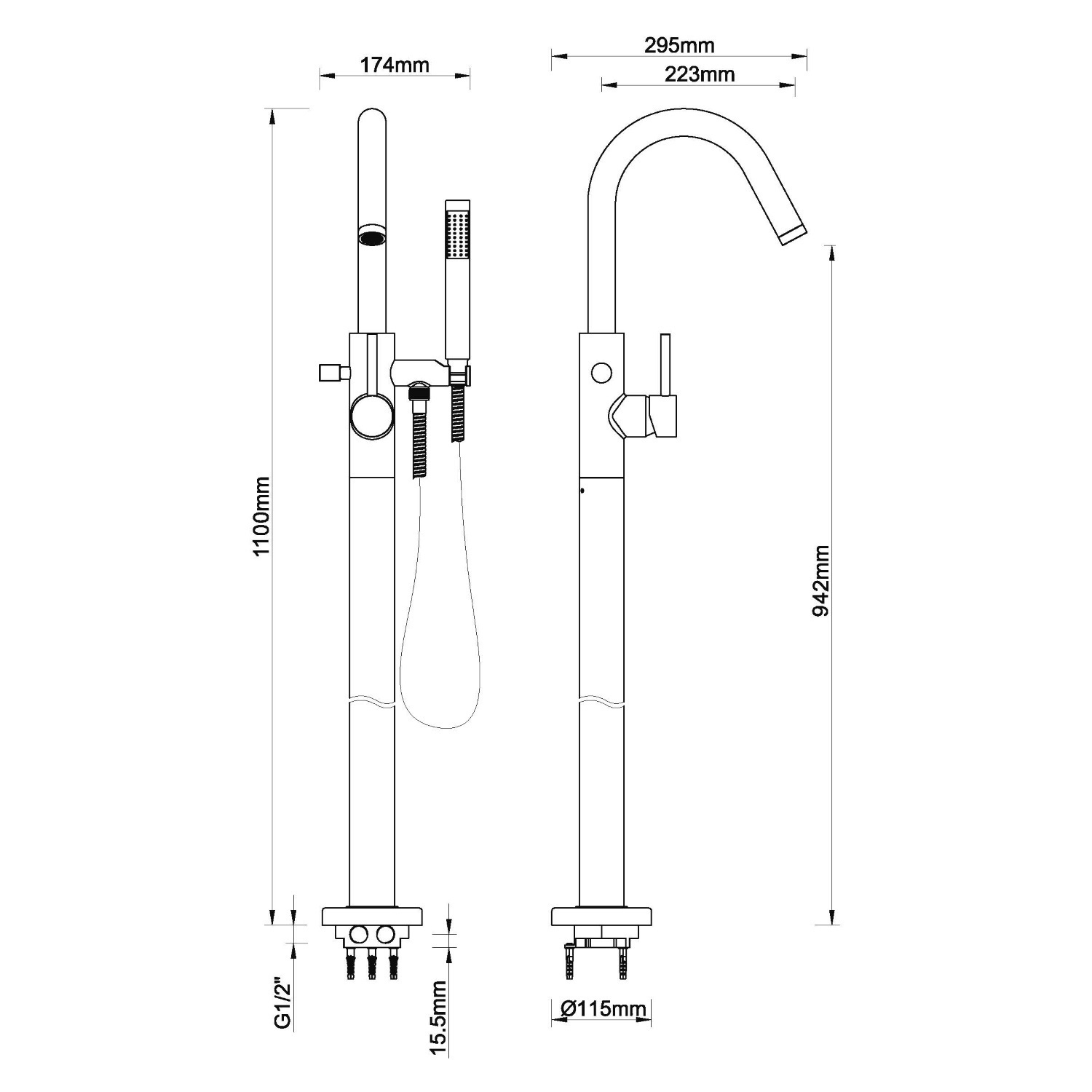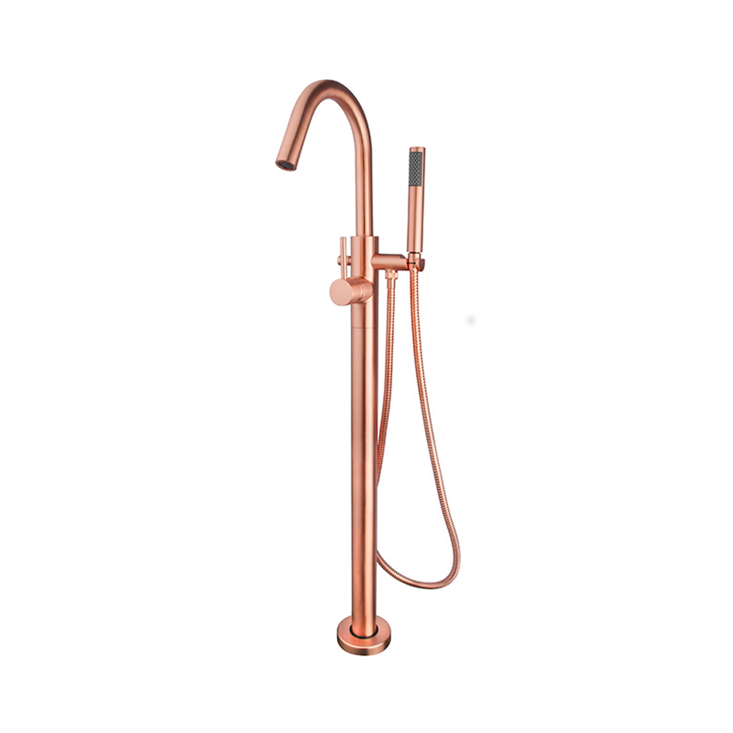 Deze vrijstaande badmengkraan is van het merk Wiesbaden en behoort tot de Caral-serie. Het betreft een bijzonder en luxe model dat is afgewerkt in de kleur geborsteld koper, waardoor deze vrijstaande badkraan direct een blikvanger in uw badkamer is. De badmengkraan heeft een hoogte van 111 cm, terwijl de hoogte van de uitloop 94,2 cm bedraagt. De uitloop heeft verder een lengte van 22,3 cm. De Caral badkraan beschikt over een 1/2''-aansluiting en een breedte van 17,4 cm. Verder wordt deze badmengkraan geleverd inclusief een doucheslang met een handdouche.