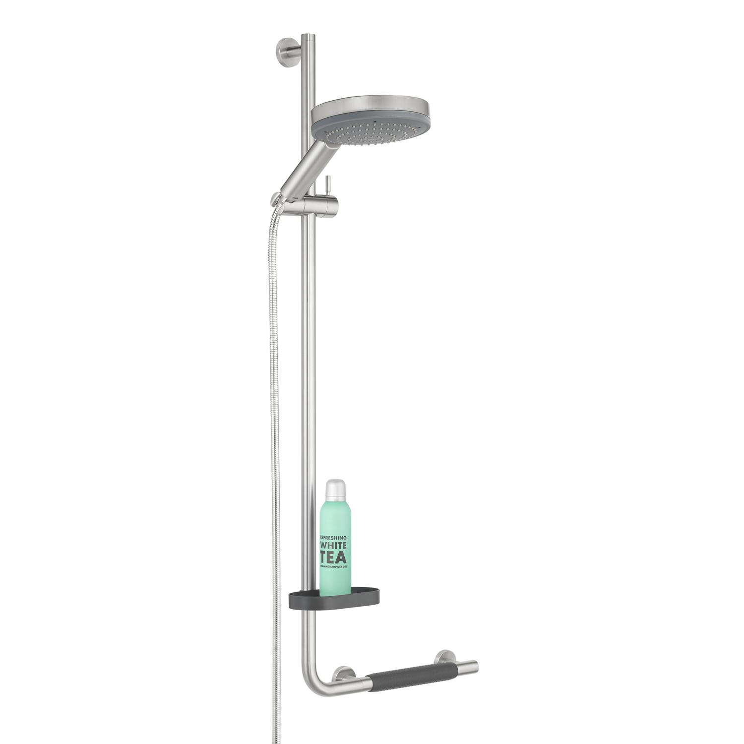 De Tiger wandbeugel met glijstang uit de serie Boston Comfort en Safety is uitgevoerd in de kleur geborsteld RVS. De Tiger Boston Comfort en Safety wandbeugel met glijstang biedt extra ondersteuning en comfort tijdens het douchen. De ergonomische veiligheidsgreep heeft een diameter van 25 mm. De Tiger Boston Comfort en Safety wandbeugel met glijstang heeft een maximale belastbaarheid van 150 kg. Het glij-mechanisme is zeer gemakkelijk te verstellen in hoogte en hoek. Daarnaast kan er een extra antislip grip op de veiligheidsgreep gemonteerd worden, deze is apart verkrijgbaar. Dit geldt ook voor de organizer.