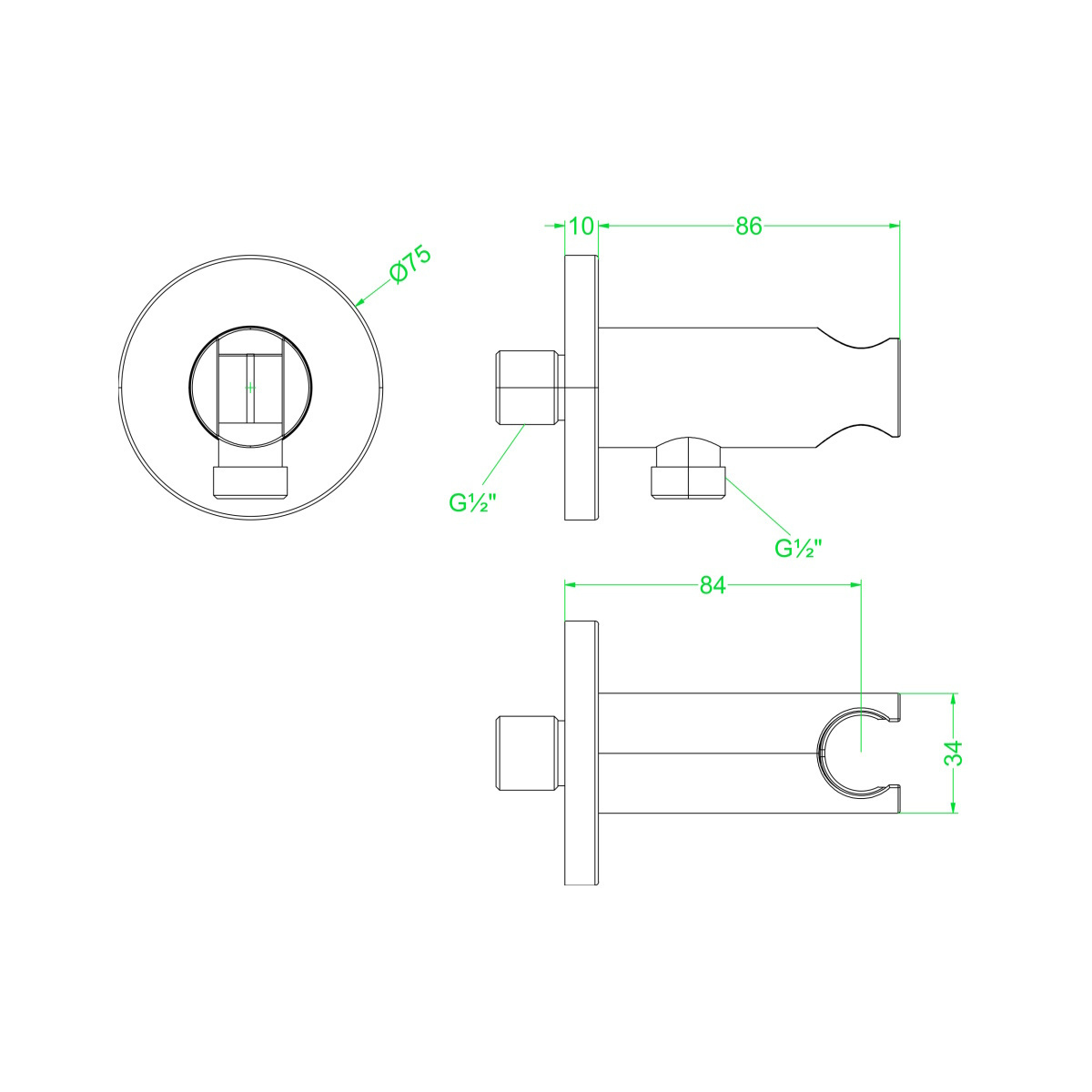 De houder heeft een Lengte van 8,6 cm cm en een breedte van 3,4 cm. De wandsteun heeft een draadaansluiting van 1/2 inch.