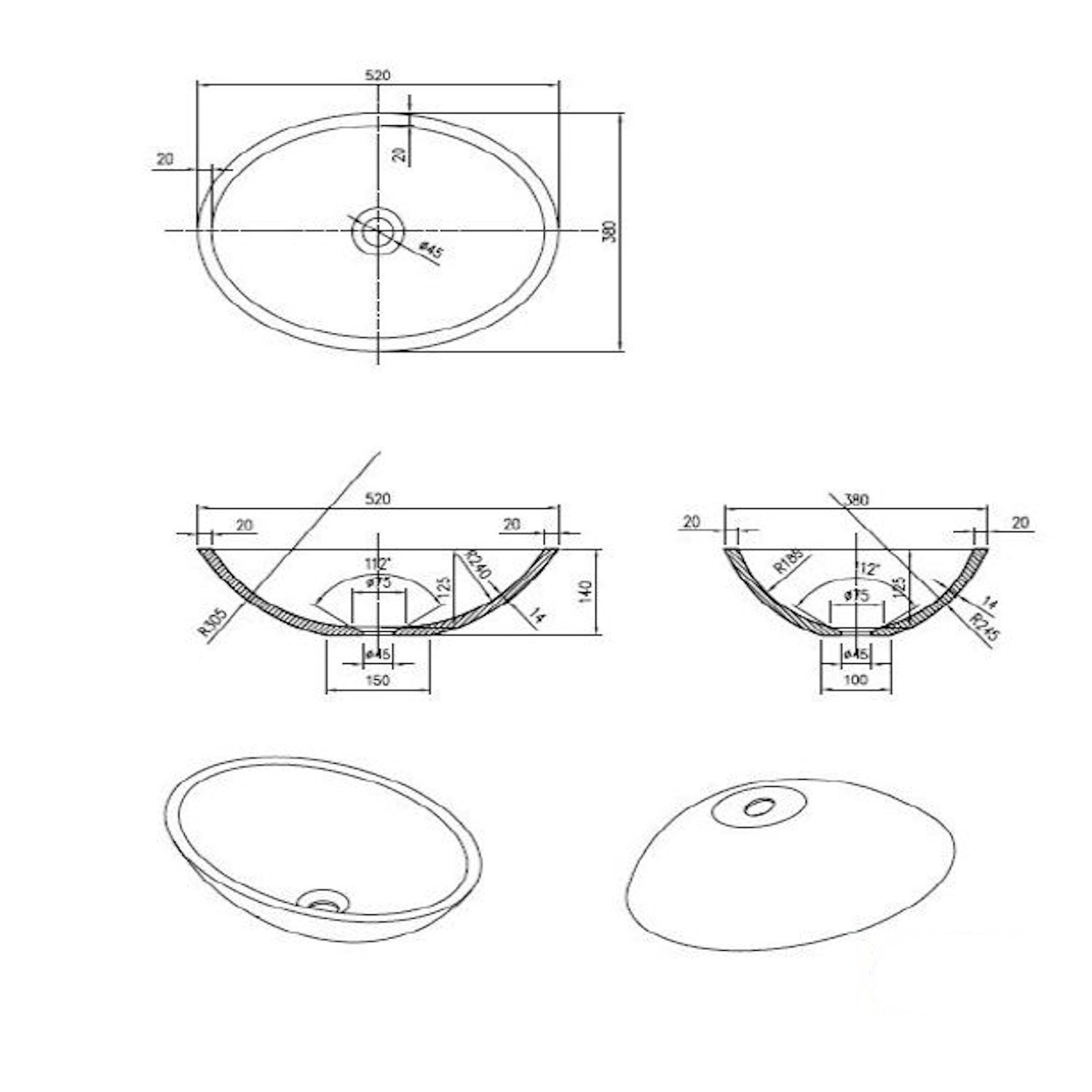 Het afvoergat heeft een diameter van 5/4" en de plaats van het afvoergat en afvoer is het midden van de waskom. De waskom is niet voorzien van een overloop en wordt geleverd exclusief kraan of afvoergarnituur.