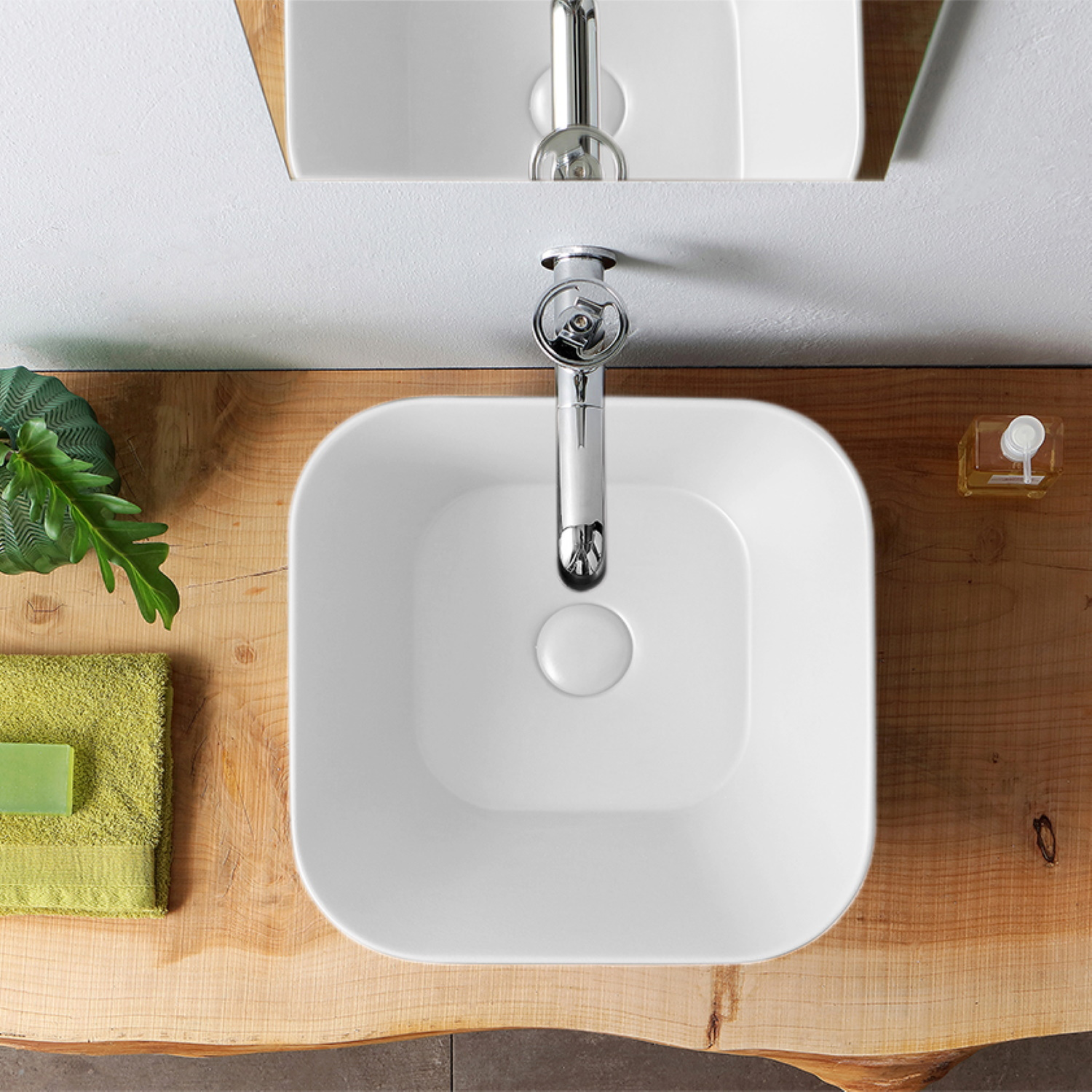 Deze Mees Design opbouw waskom zorgt met zijn fraaie mat witte uitstraling en unieke vorm een moderne look in uw badkamer. Zeker als u de waskom combineert met andere mat witte items in uw badkamer. De waskom kent een breedte van 42 cm, diepte van 42 cm en heeft een hoogte van 16.5 cm.
