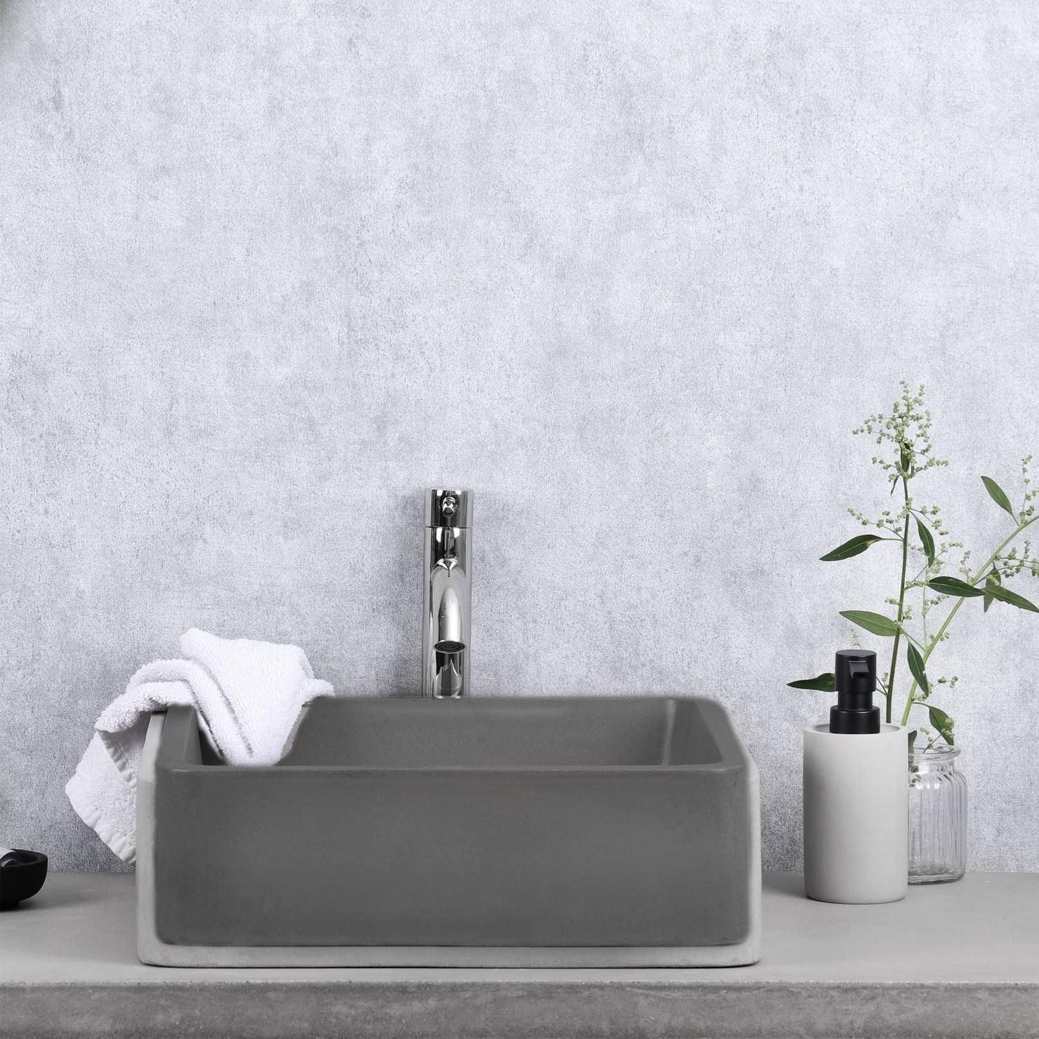 De vierkante waskom van het merk Differnz heeft met zijn hoge wanden en betonnen materiaal een stoer en robuuste uitstraling. De waskom past perfect in een stoere en industriële badkamer, zeker in combinatie met een mat zwarte kraan en sifon. Daarnaast zorgen de hoge randen ervoor dat u minder water zult spetteren op uw wastafel. De waskom is 12 cm hoog, 40 cm breed en 40 cm diep.