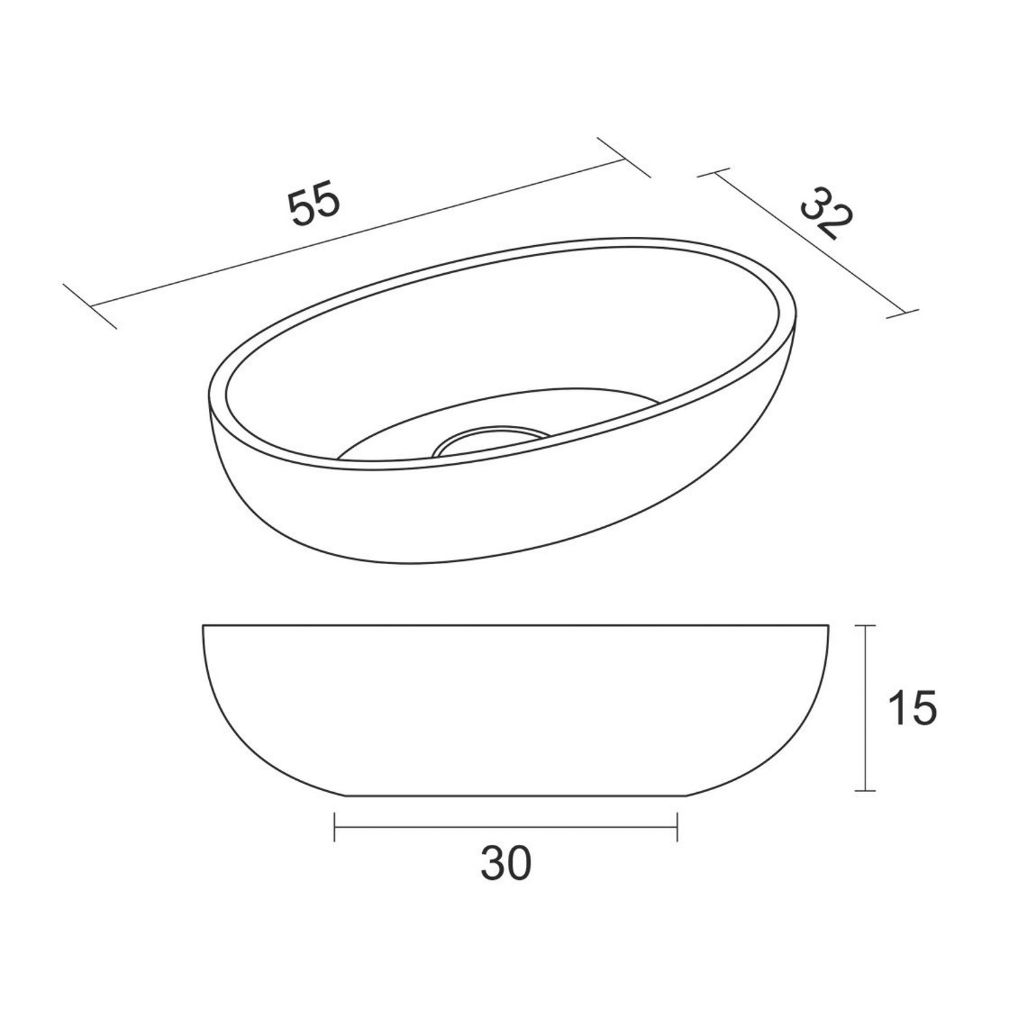 Deze kom bevat geen kraangaten en geen overloop. De waskom heeft een breedte van 55 cm en een diepte van 32 cm. De kom is 15 cm hoog. Het diameter van de afvoer is 4,5 cm in doorsnee.