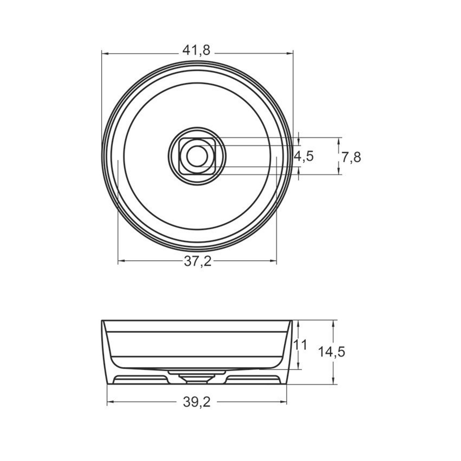 De waskom heeft een doorsnee van 41.8 cm. De kom is 14.5 cm hoog. Het diameter van de afvoer is 4,5 cm in doorsnee.