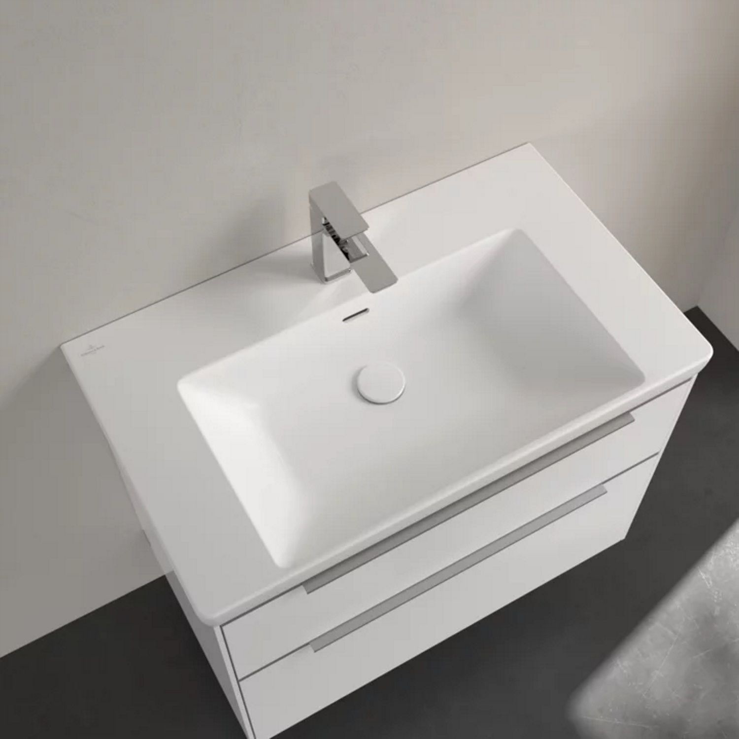 Deze moderne witte wastafel past door de strakke en fijne vormen in elke ruimte. Door de grote kranenbank en brede randen is er genoeg ruimte om spullen op kwijt te kunnen. Hierbij kunt u bijvoorbeeld denken aan een zeepdispenser of een elektrische tandenborstel. De wastafel is 80 cm breed, 47 cm diep en 16.5 cm hoog en is gemaakt van TitanCeram. Dat is een duurzaam materiaal dat door Villeroy & Boch zelf wordt gecreëerd door verschillende grondstoffen te versmelten. Het is extra stevig waardoor de wastafel lang mee gaat.