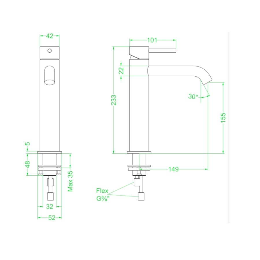 De wastafelkraan heeft een hoogte van 23,3 cm. Heeft een uitloop hoogte van 15,5 cm en een uitloop diepte van 14,9 cm. De kraan heeft een draadaansluitmaat van (inch) 3/8.