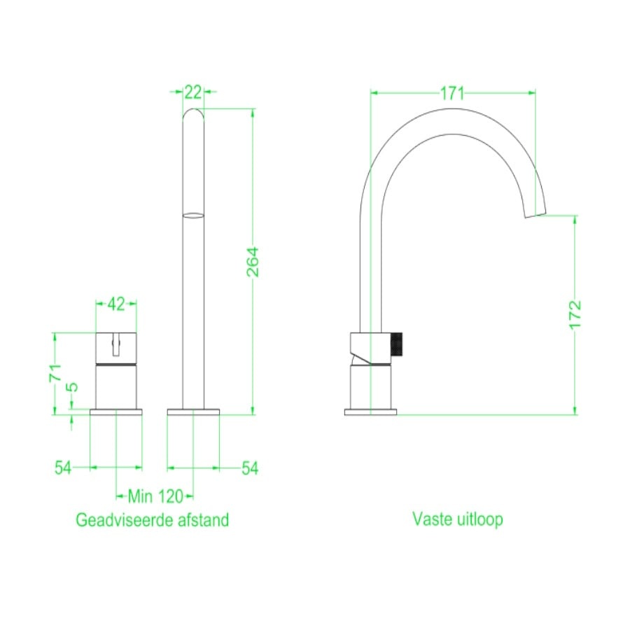 De wastafelkraan heeft een hoogte van 26,4. De uitloop hoogte van de kraan is 17,2 cm en de uitloop diepte is 17,1 cm. De kraan heeft een diameter van 2,2 cm en een maatdraadaansluiting van 3/8 inch.