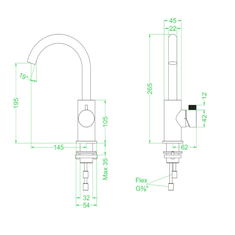 De wastafelkraan heeft een hoogte van 26,5 cm, heeft een hoogte uitloop 19,5 cm, heeft een diepte uitloop 14,5 cm, heeft draadaansluiting van (inch) 3/8 en is een mengkraan met een draaibare uitloop.
