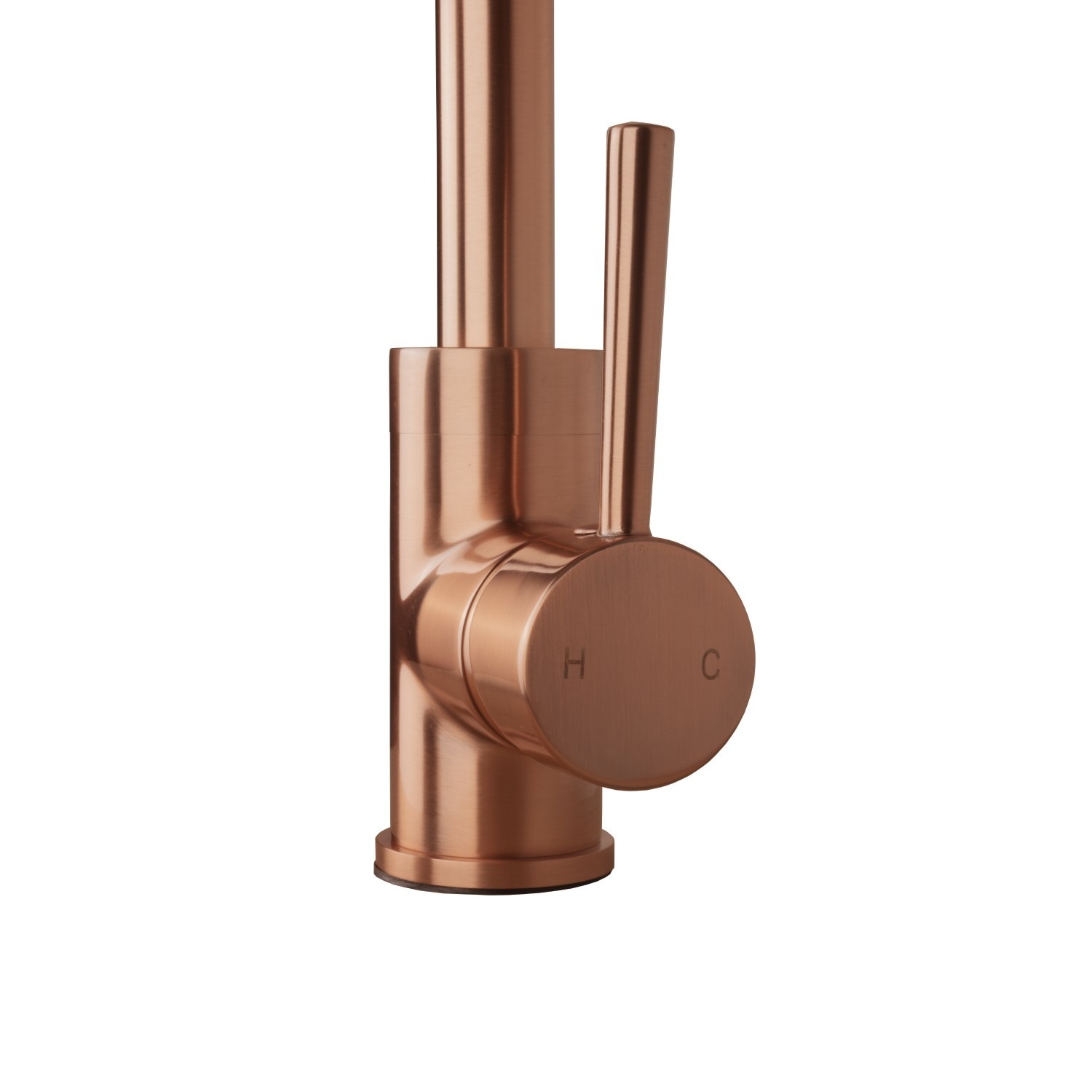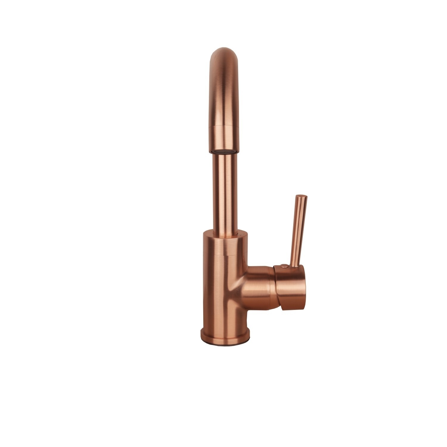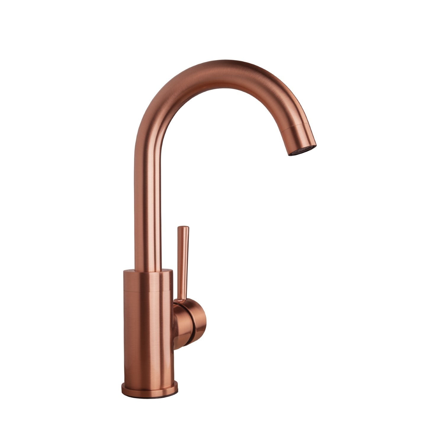 Deze wastafelkraan van het merk Aqua Splash behoort tot de Colorato-serie. Het betreft een opbouw mengkraan die is gemaakt van messing en een afwerking heeft in een geborstelde koper kleur. De kraan heeft een hoogte van 28 cm en is aan de bovenzijde voorzien van een hendel. Met deze hendel stelt u eenvoudig de temperatuur en de kracht van de waterstraal in. Door zijn strakke uiterlijk past deze kraan in iedere moderne badkamer. De uitloop van deze kraan is draaibaar, hierdoor kunt u de kraan zelf instellen!