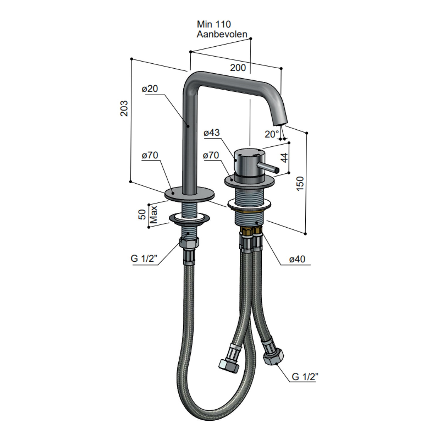 De kraan heeft rechte delen en ronde bochten waardoor het modern en stijlvol oogt. De diepte van de uitloop is 20 cm en de aanbevolen afstand tussen uitloop en hendel is 11 cm. Met een draadaansluiting van 1/2" heeft het een gangbare maat en past het vrijwel zeker ook in uw ruimte. Tot slot heeft u 10 jaar garantie dus gegarandeerd lang plezier.