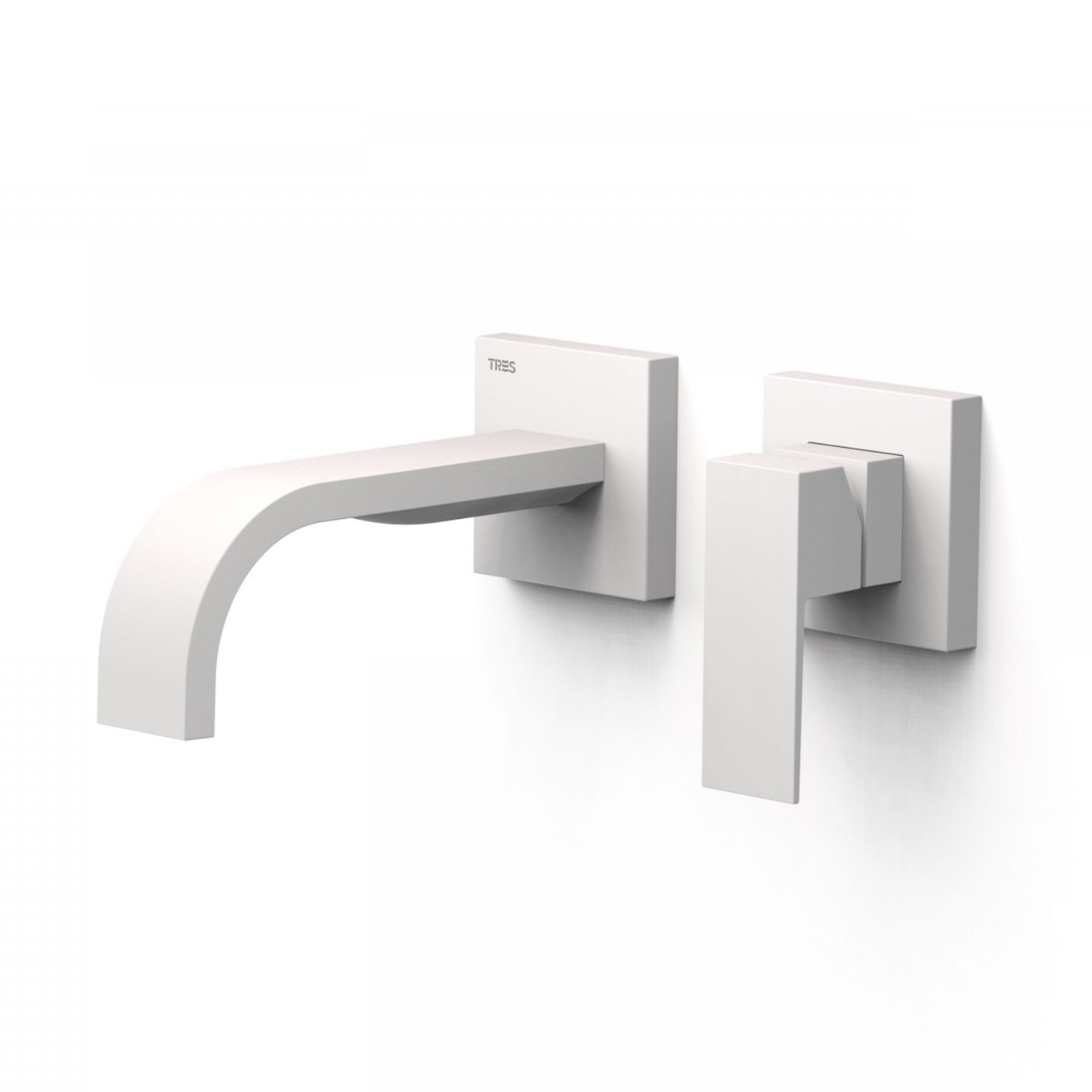 Deze inbouw wastafelkraan van de serie 'Cuadro Exclusive' van Tres heeft een uniek design. De uitloop en hendel zijn twee losse delen. De uitloop is gebogen. Deze kraan geeft uw badkamer een moderne touch. Hij is van messing in de kleur mat wit.