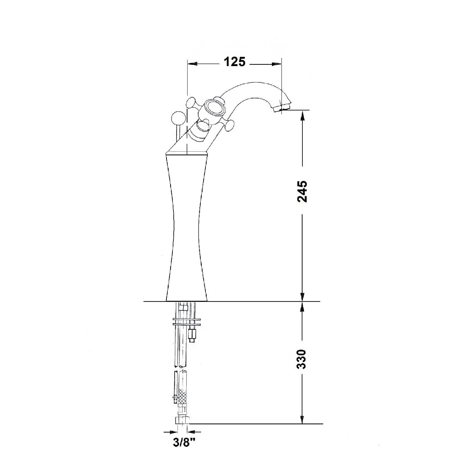 De uitloop heeft een hoogte van 24.5 cm en een diepte van 12.5 cm. De mengkraan is voorzien van een 3/8 inch aansluiting.